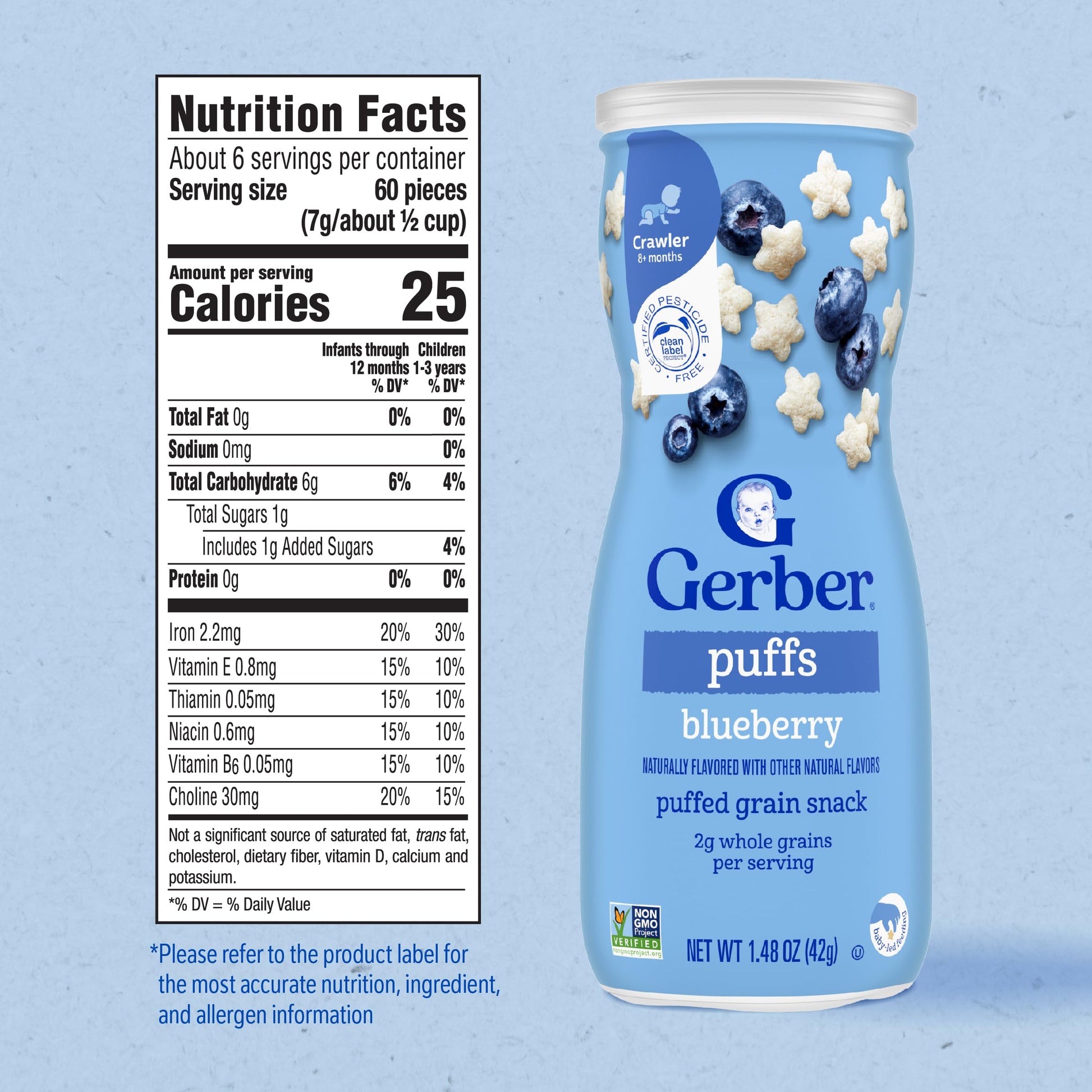 Nourish your little one with whole grain goodness by serving Gerber Puffs Cereal Snack at snack time. Gerber Puffs Cereal Snack have 2 grams of whole grains per serving, and 5 vitamins and minerals making them an ideal snack for your older baby learning to self-feed. Gerber Puffs Cereal Snack are easy to chew and swallow and are just the right size for little hands to pick up and enjoy.