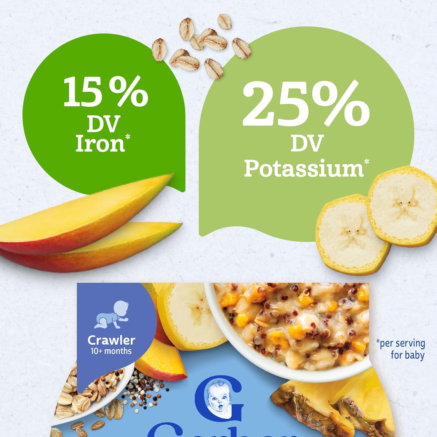 - TASTY MORNINGS: Gerber oatmeal makes an easy and nutritious baby breakfast. Ready to eat in under 5 minutes, this organic baby oatmeal with quinoa, farro and tropical fruit is perfect for busy parents who seek quality and convenience