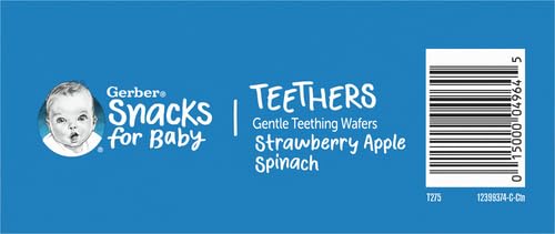 Gerber Strawberry Apple Spinach Teething Wafers are made to massage tender gums gently and are perfectly shaped for little ones to grasp on their own. Made with real fruits, juice and veggies, these teething biscuits have a delicious flavor that holds your baby’s interest while providing soothing relief. Gerber teethers are gluten free and unsalted, and they have no artificial flavors, colors or sweeteners, and they are. Designed to dissolve easily, these baby biscuits help your child get past the troublesome teething stage. These baby teething wafers are individually packaged in sets of two for convenient packing in a diaper bag.