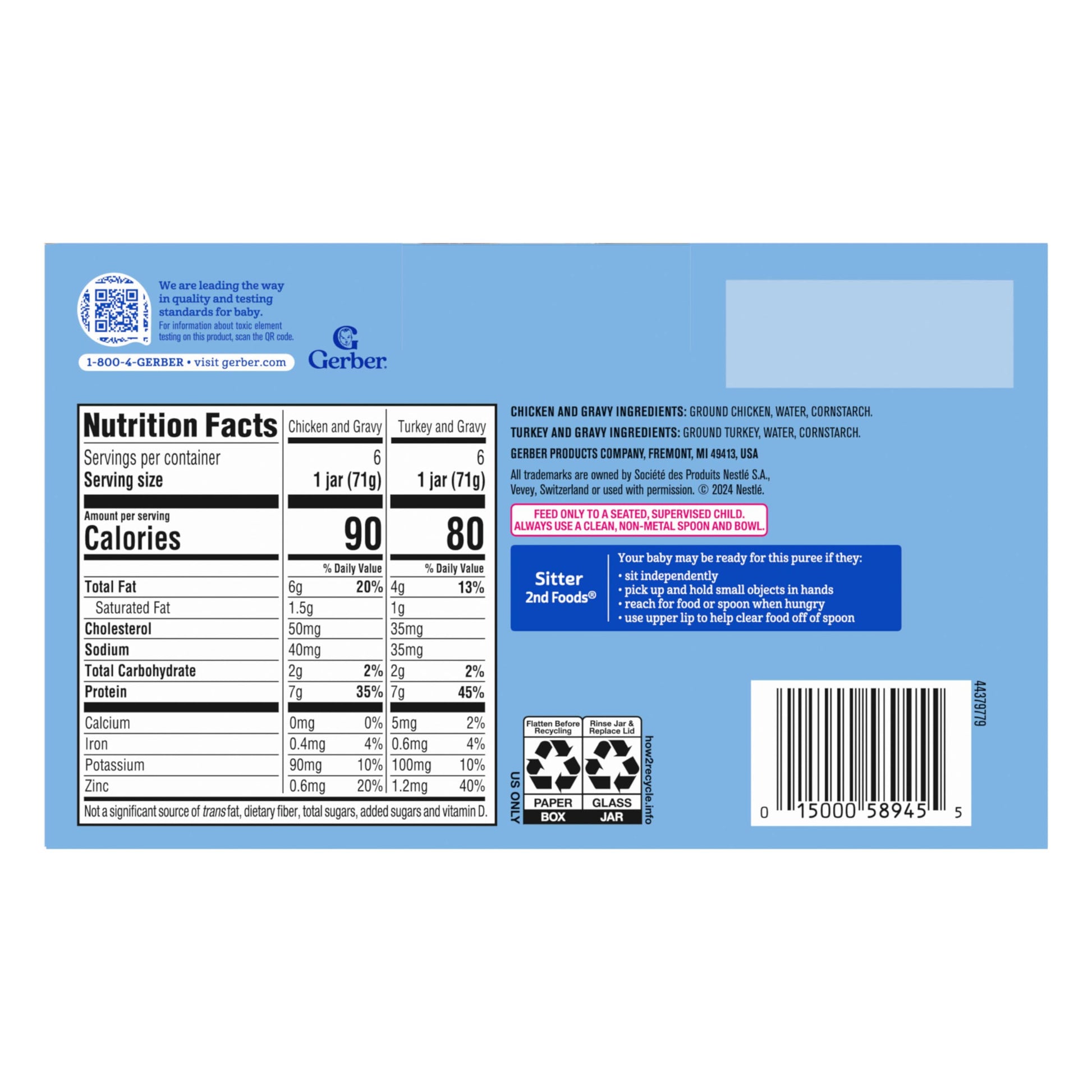 This variety 12 pack comes with 2 puree classics, Chicken & Gravy, and Turkey & Gravy. Our Gerber Baby Food Jars are crafted with wholesome ingredients and are a premium choice for your little one. These stage two baby food poultry jars are designed for babies who are ready to explore new textures and flavors. They also provide your little one with a smooth and enjoyable eating experience, making them a great addition to your baby's diet. Gerber baby food understands the importance of providing nutritious and wholesome ingredients as your little one grows. Our baby puree is a trusted choice for countless families.