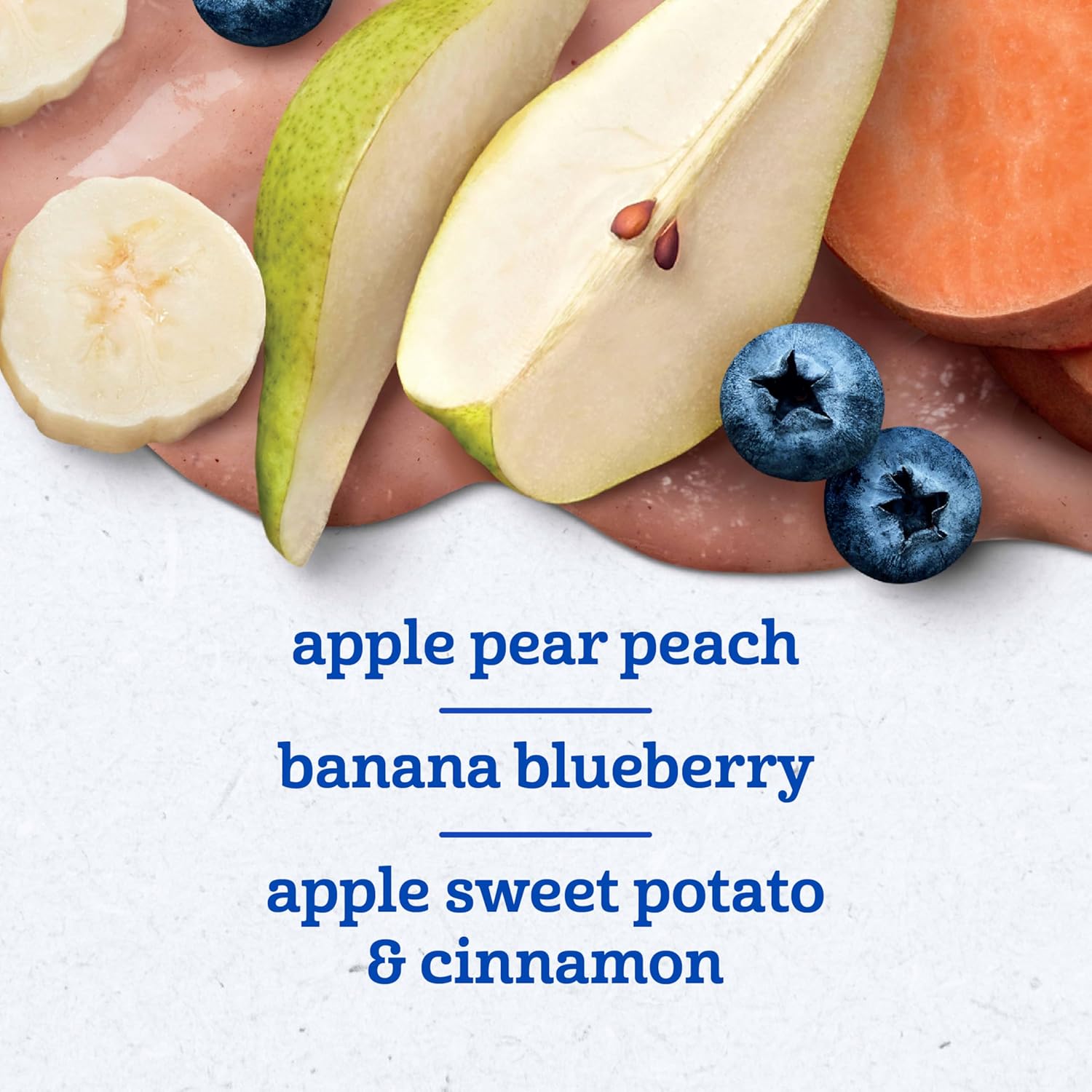 - VARIETY OF PUREED FRUITS & VEGGIES: Our Gerber pouches variety pack comes with 3 puree favorites: apple pear peach, banana blueberry, and apple sweet potato cinnamon