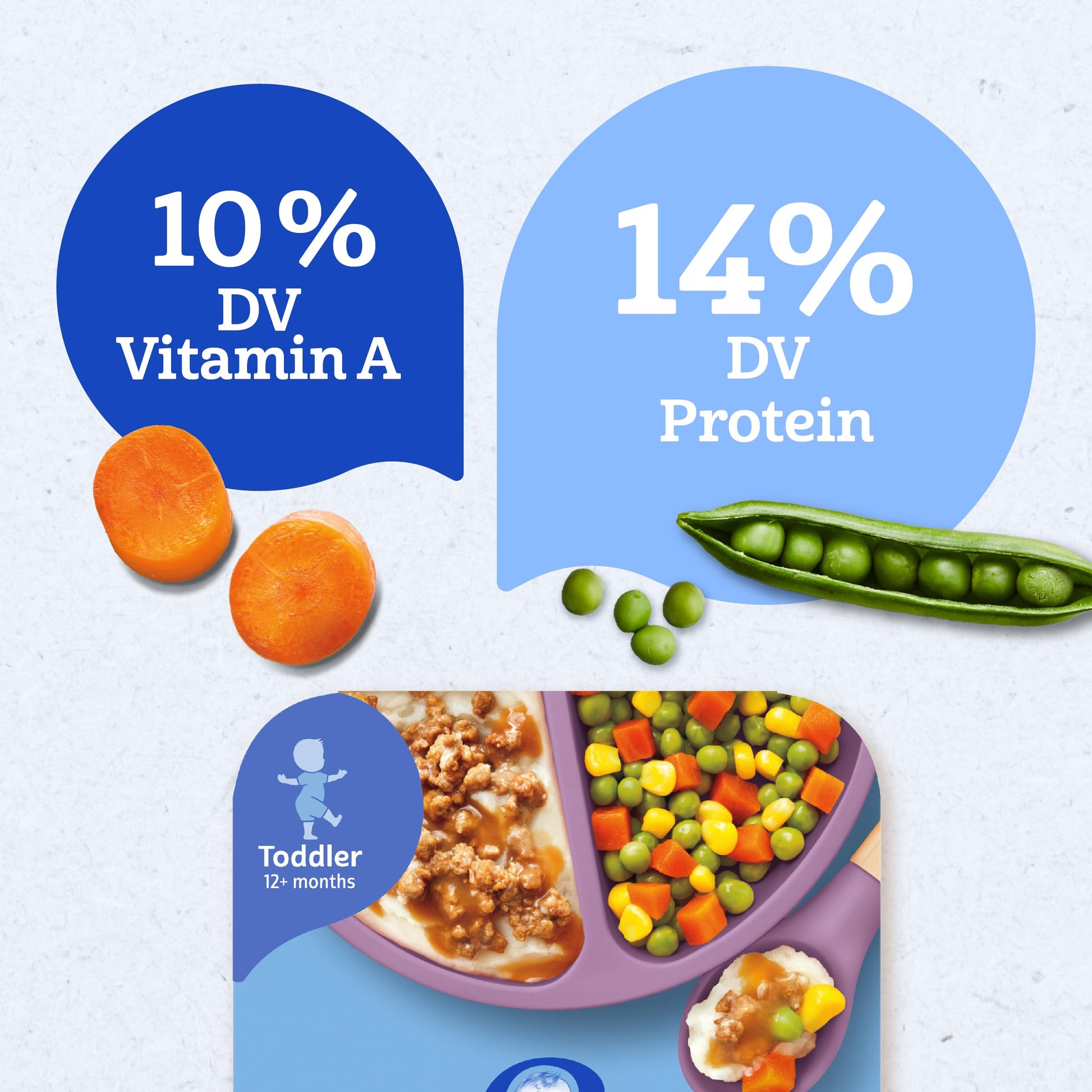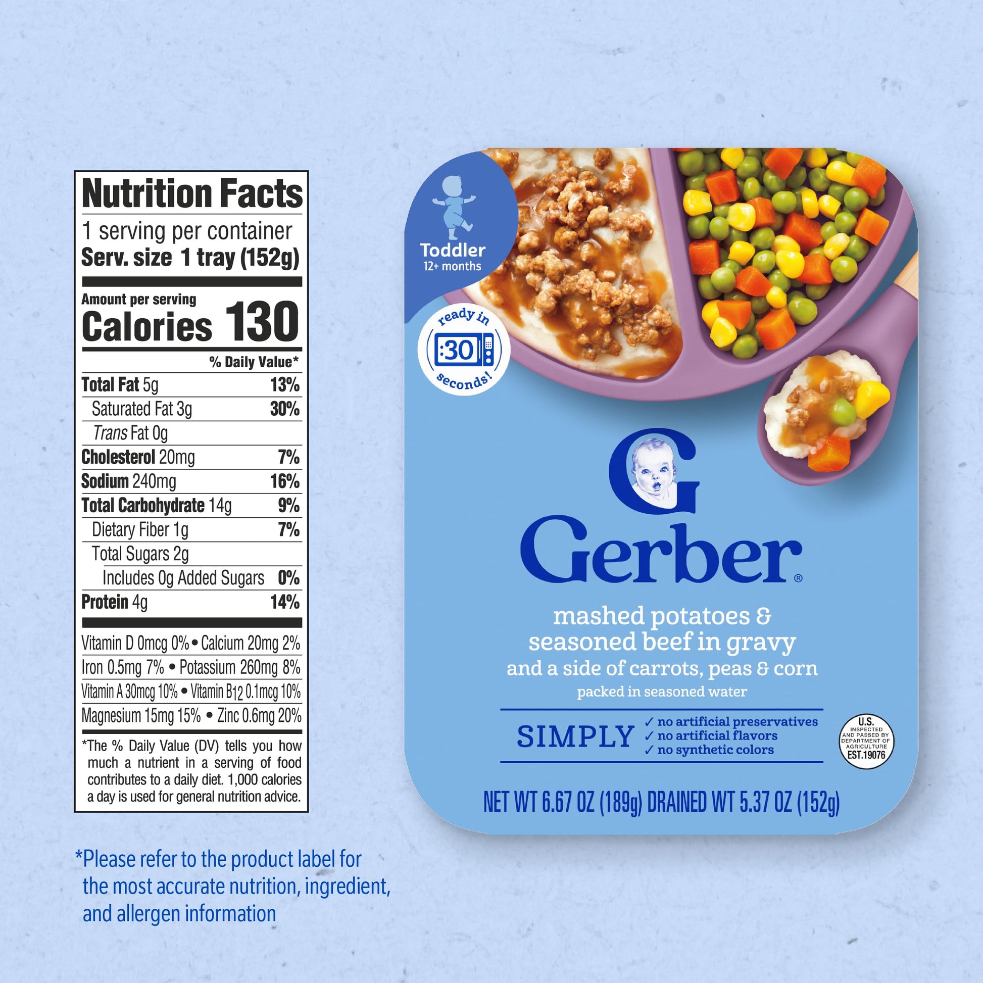 - MEALTIME FOR TODDLER: This toddler approved mealtime comes with mashed potatoes & seasoned beef in gravy with a side of carrots, peas and corn. Ready to eat in under 5 minutes, Gerber mealtime for toddlers is perfect for busy parents who need a quick and nutritious option for their little one