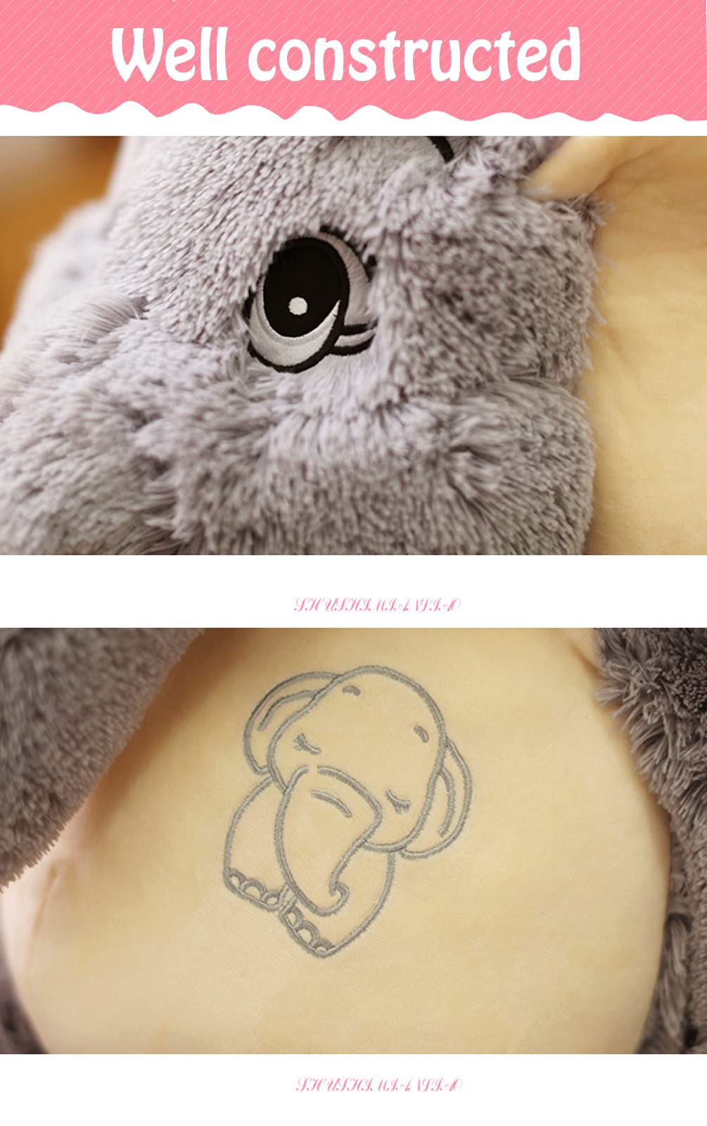 - 【Giant Elephant Stuffed Animal】This cuddly elephant teddy is pretty big soft and thick.I'm sure it will be a big comfortable pillow when you're home recuperating.It makes a great cuddle buddy and excellent for watching TV The big size is also perfect to grow with kids, to cuddle and lay on. The soft and full touch will clear all anxiety and tension.