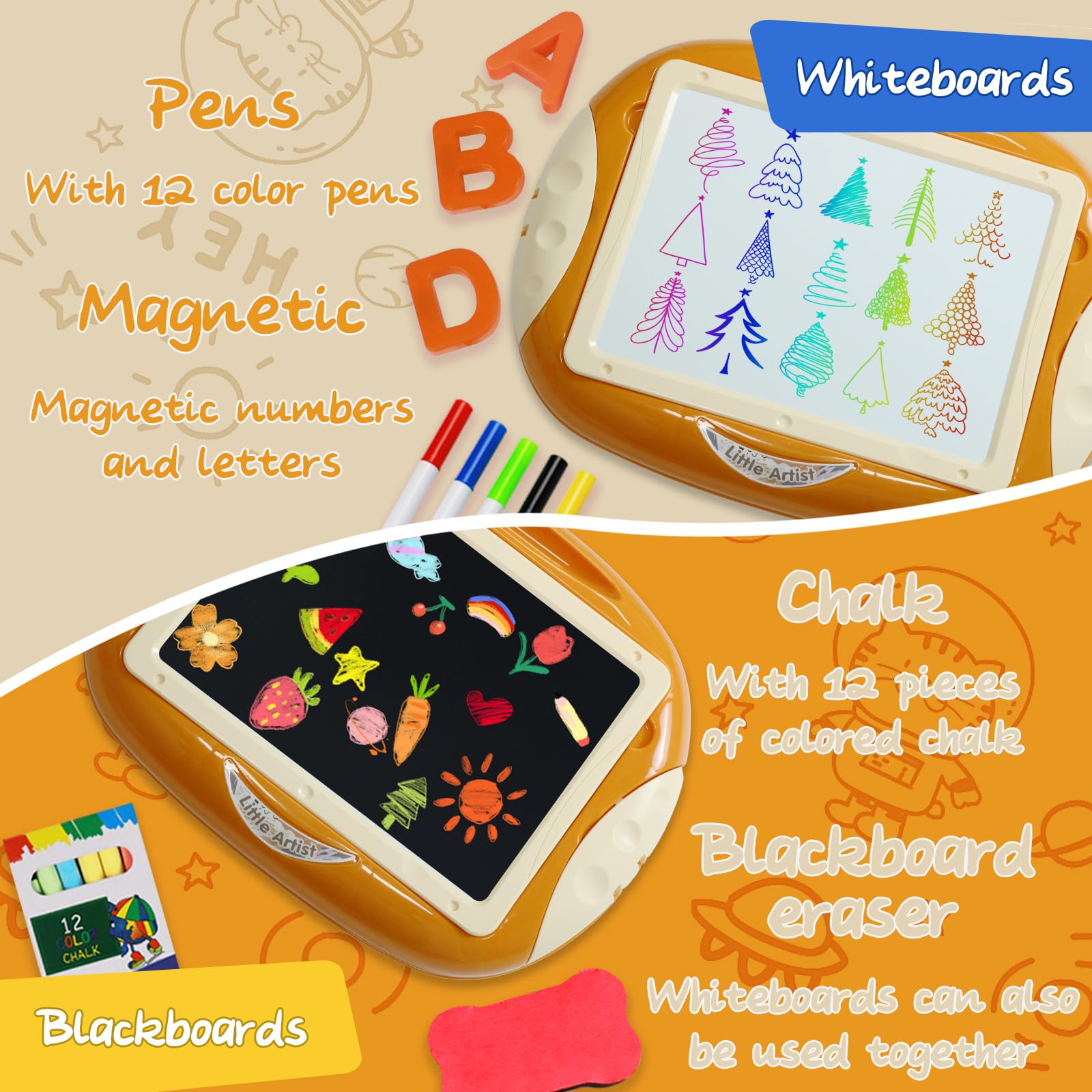 - 🎨【Double Sided Drawing Art Toy】 - Toddler learning table, provides double-sided painting experience. The magnetic whiteboard supports watercolor painting, do the math while creating vivid and colorful paintings on the whiteboard by adding magnetic letters and numbers (magnetic letters and numbers are for whiteboard use only). The other side of the board can be used for simple calligraphy, and toddlers can use the chalk to hone their writing skills.