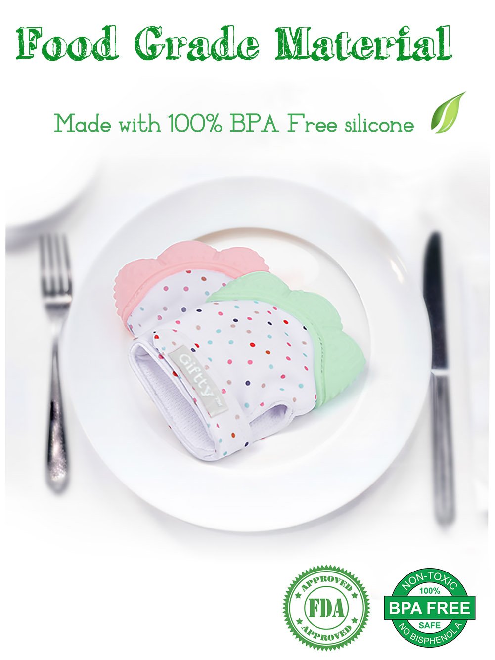 Giftty teething mitten is an innovative baby teether, that features food-grade soft silicone, crinkle sound, adjustable hook & loop strap, helps baby entertains themselves, relieves teething sore gums and protects baby from scratching.