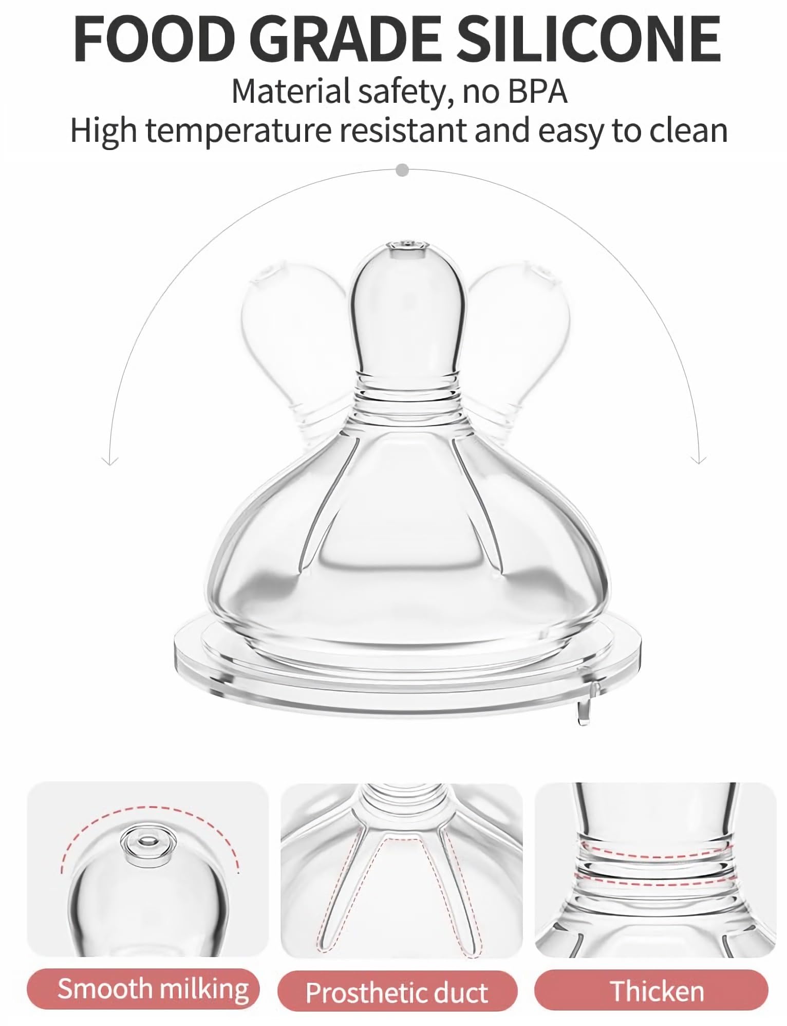 - ★Transition from Breast with Breast-Shaped Nipple: With a breast shape, the nipple mimics the shape and feel of a breast to give babies a sense of satisfaction and security to ease the transition from breast to bottle; Made of food-grade silicone, the nipples are made tens of thousands of pulling experiments and can protect baby’s gums well;