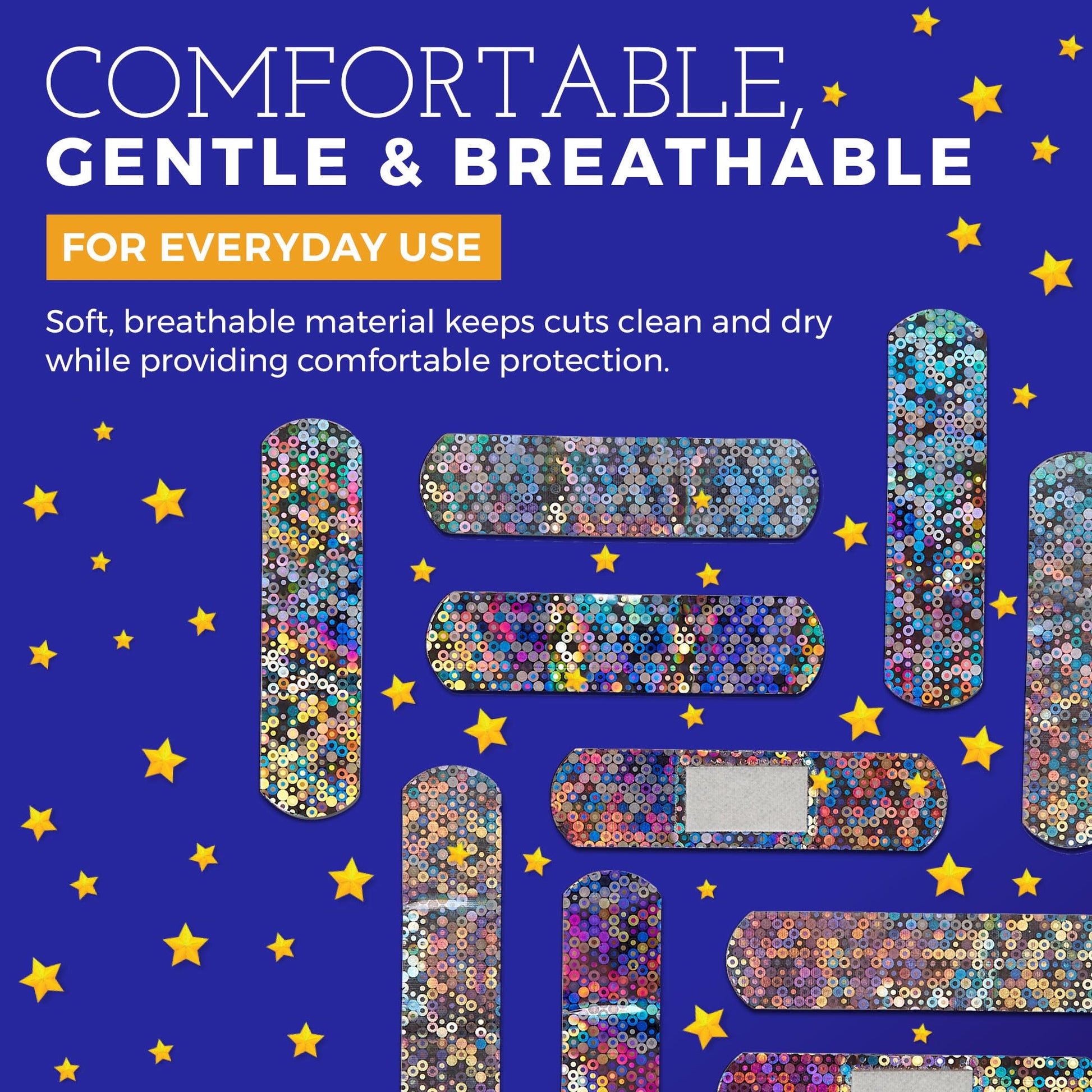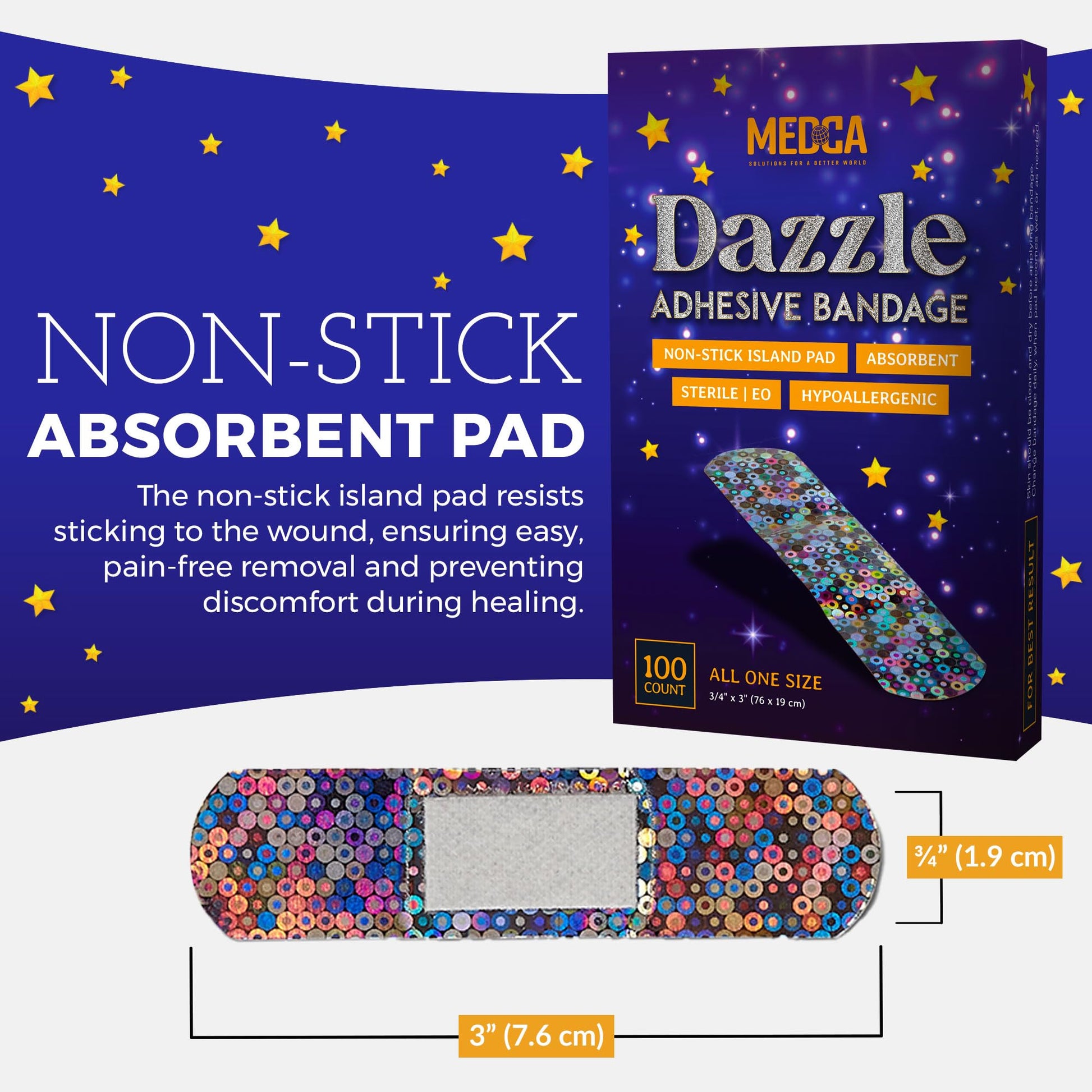 - CUTE AND ADORABLE SHIMMERY DESIGN: Make your day shine a little bit brighter with these fashionable and fun glitter bandages. The shimmering sparkle design shows sparks of silver and gold. Each Bandage measures 3/4 x 3 inches, these novelty bandages will help brighten your kid's day after a scrape or a bruise. With 100 pieces in the box, you will have enough supply to last for months