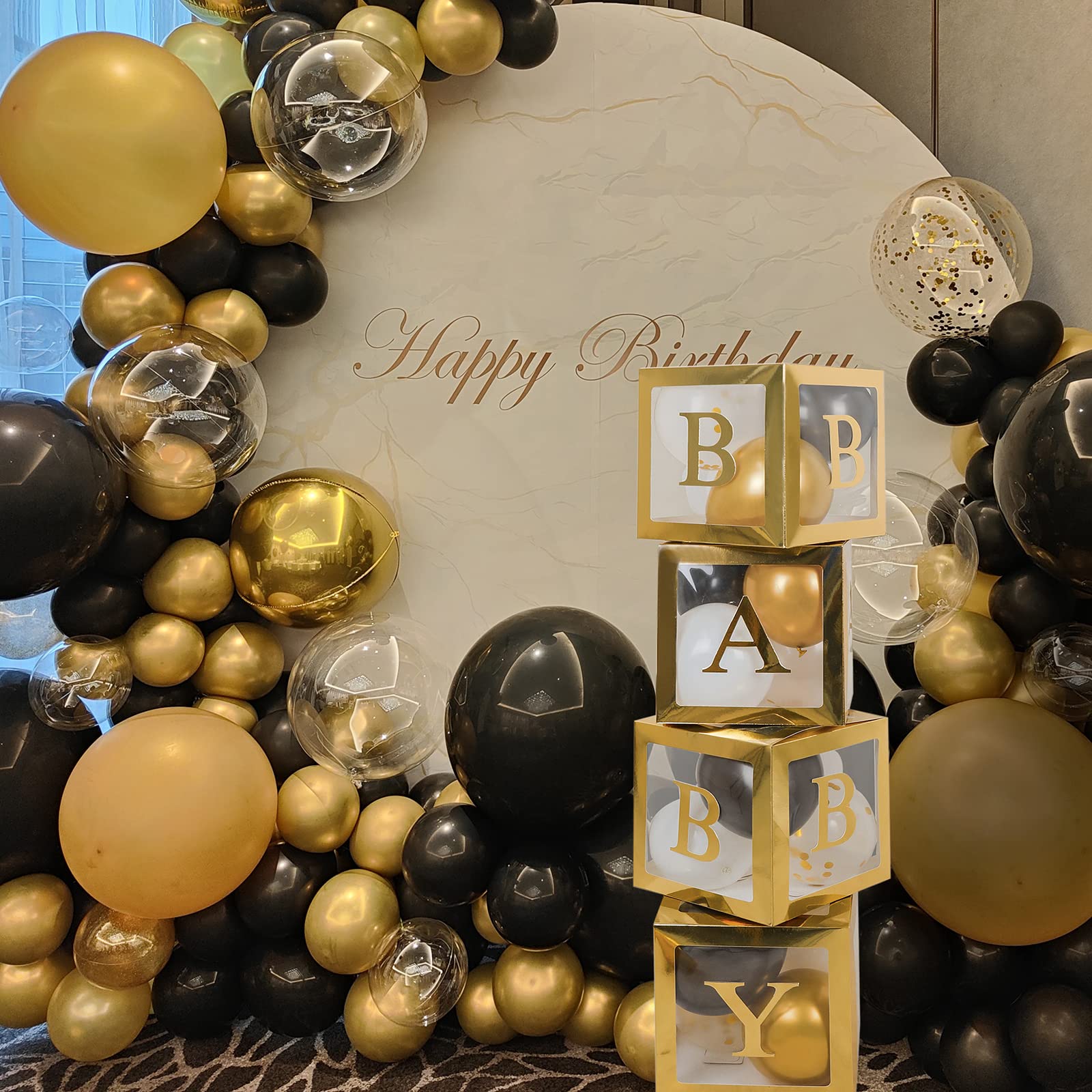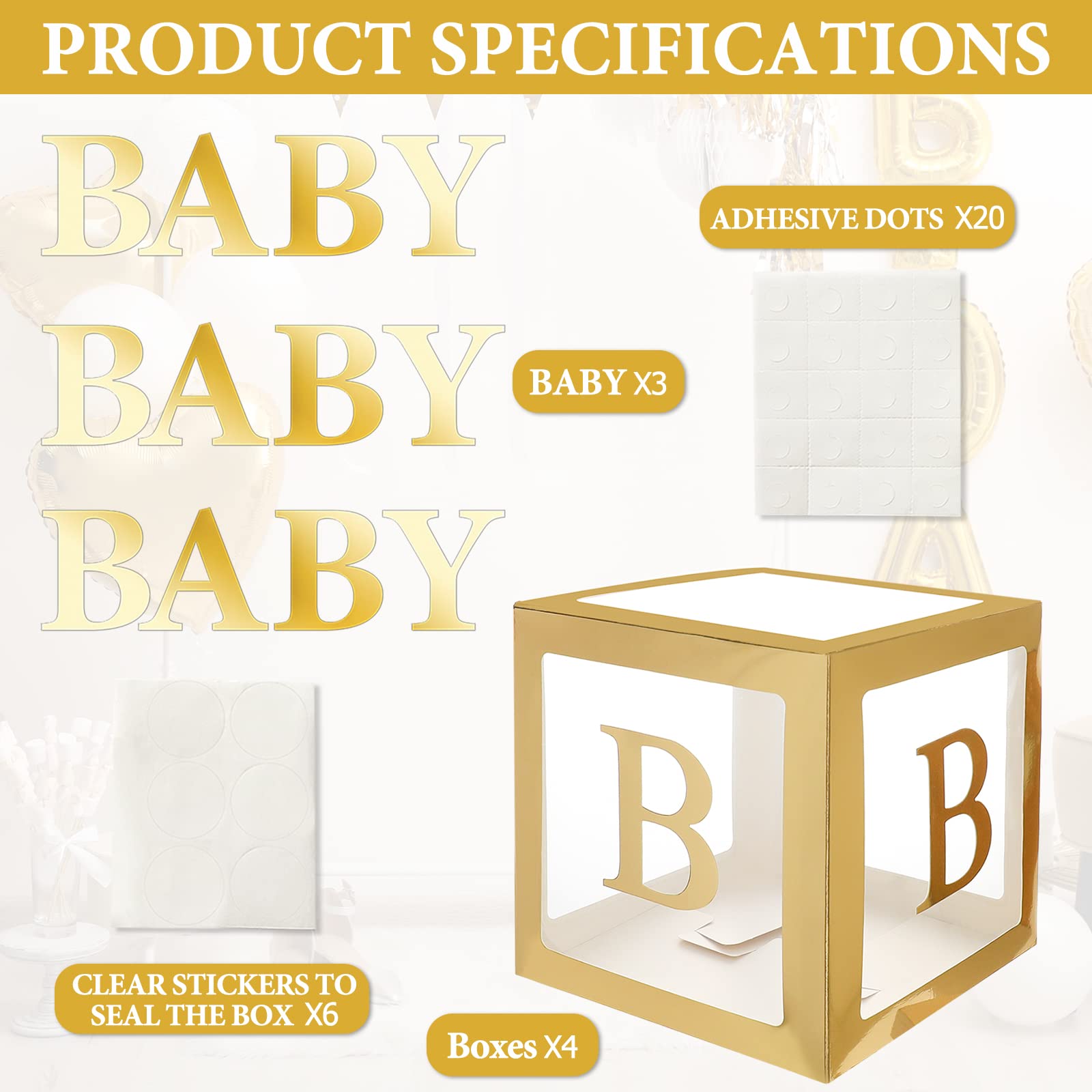 - 【Baby Shower Decorations for Boy Girl】4pcs Gold transparent boxes + 12 pcs“BABY” letters. Different from other brands, we use adhesive dots instead of adhesive letters so that you could use the letters multiple times,and also add extra transparent round stickers which could seal the top to avoid popping.Please note that *Balloons are NOT Included*