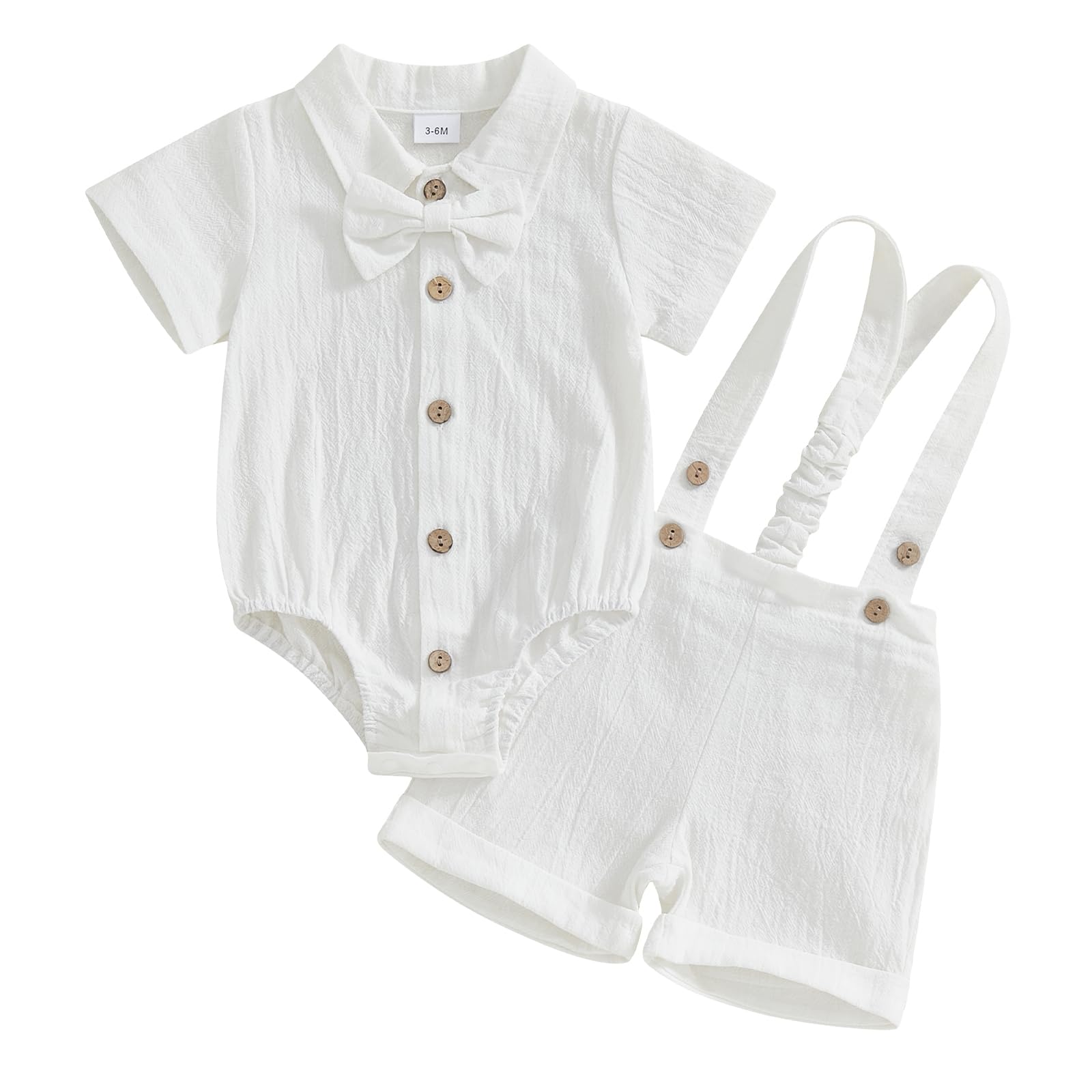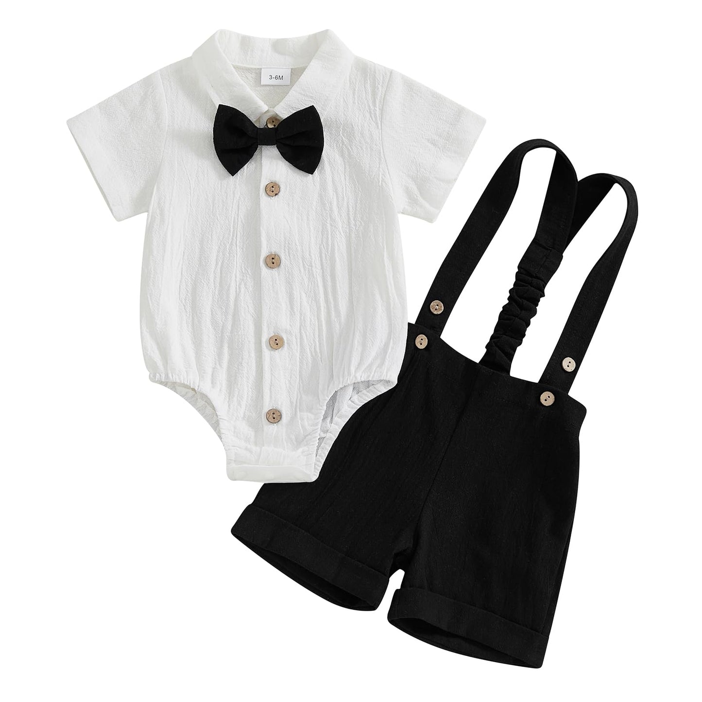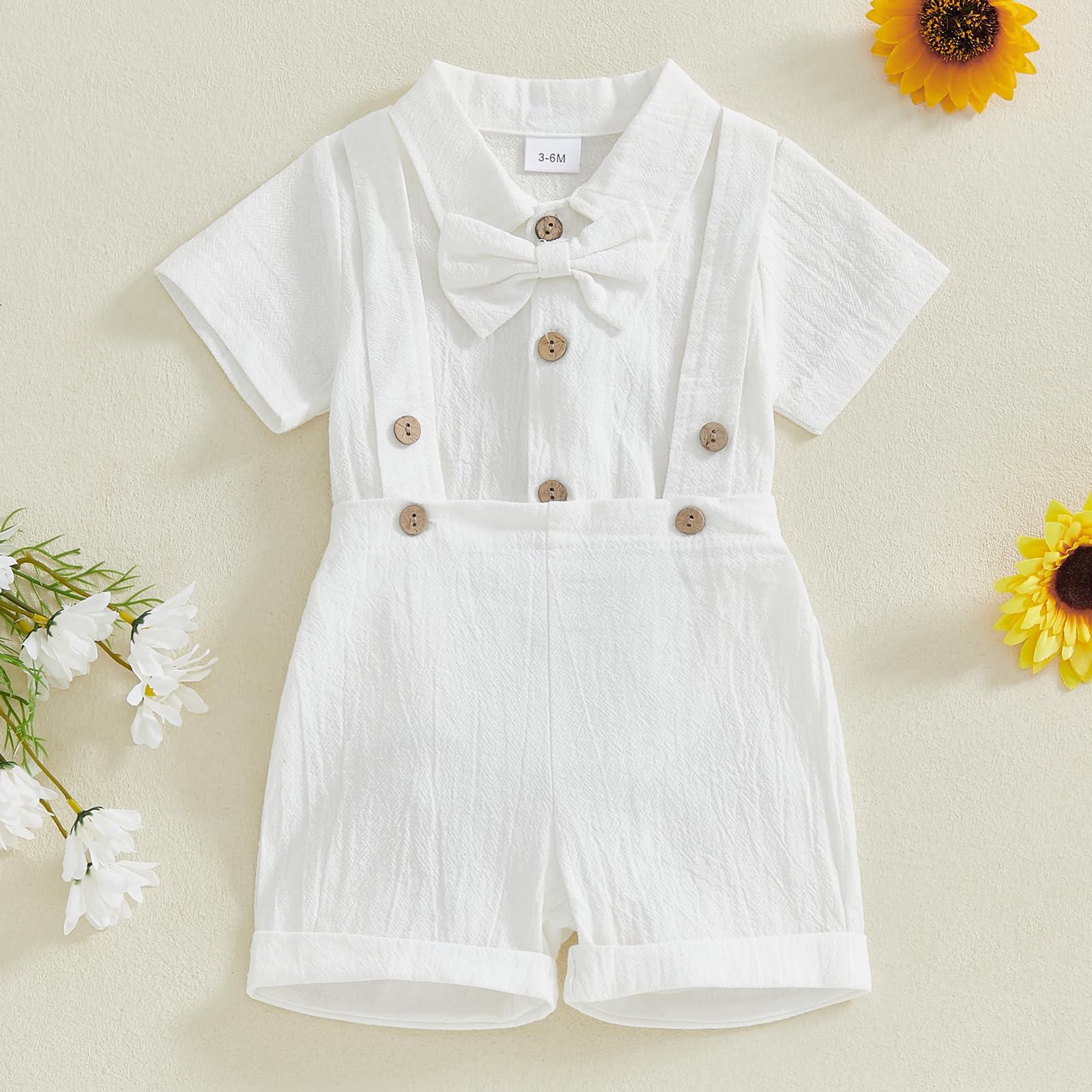 - DESIGN: Infant dress clothes boys, baby boy formal outfits summer, baby tuxedo onesie, baby boy dress shirt, short sleeve romper shirt with bow tie, crossback strap jumpsuit baby boy, turn-down collar design, matching baby boy suspender shorts, baby boy button down pant set, elastic waist, cute and fashion style
