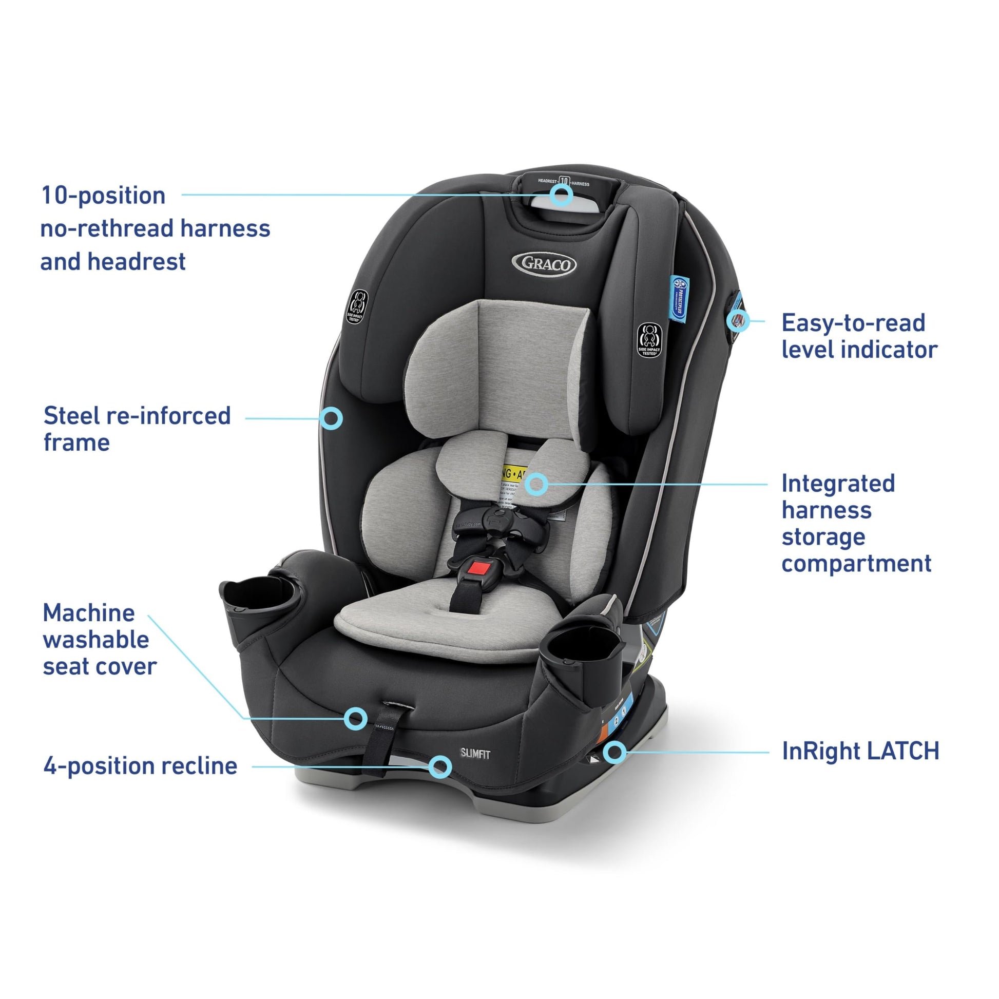 The Graco® SlimFit® 3-in-1 Car Seat grows with your child, from rear-facing harness (5-40 lb) to forward-facing harness (22-65 lb) to highback booster (40-100 lb). It saves space in your back seat, while giving your child plenty of room to grow. The unique, rotating cup holders simply rotate away, making the seat 10% slimmer to save precious back seat space. The Simply Safe Adjust™ Harness System means you can easily adjust the harness and headrest together, to accommodate your growing child with ease. With 4 recline positions, you can keep your child comfortable, while the InRight™ LATCH system makes installation easy with a one-second attachment. The seat is Graco® ProtectPlus Engineered™ to help protect your little one in frontal, side, rear, and rollover crashes.
