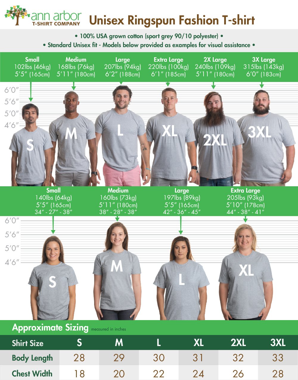 - UNISEX MODERN FIT SIZING | this shirt is slightly tapered to be a little less boxy than the old style of mass-market t-shirt. Nothing drastic, and most people wear the same size in our shirts as they do in all of their others, but you might go one size larger if you're on the fence. It is pre-shrunk, but like any high-cotton product, will still shrink slightly in the wash. Our model photos are the real thing - the actual shirt on our salesguy, Rich. He's 6' 2", 200 lbs and wearing a large