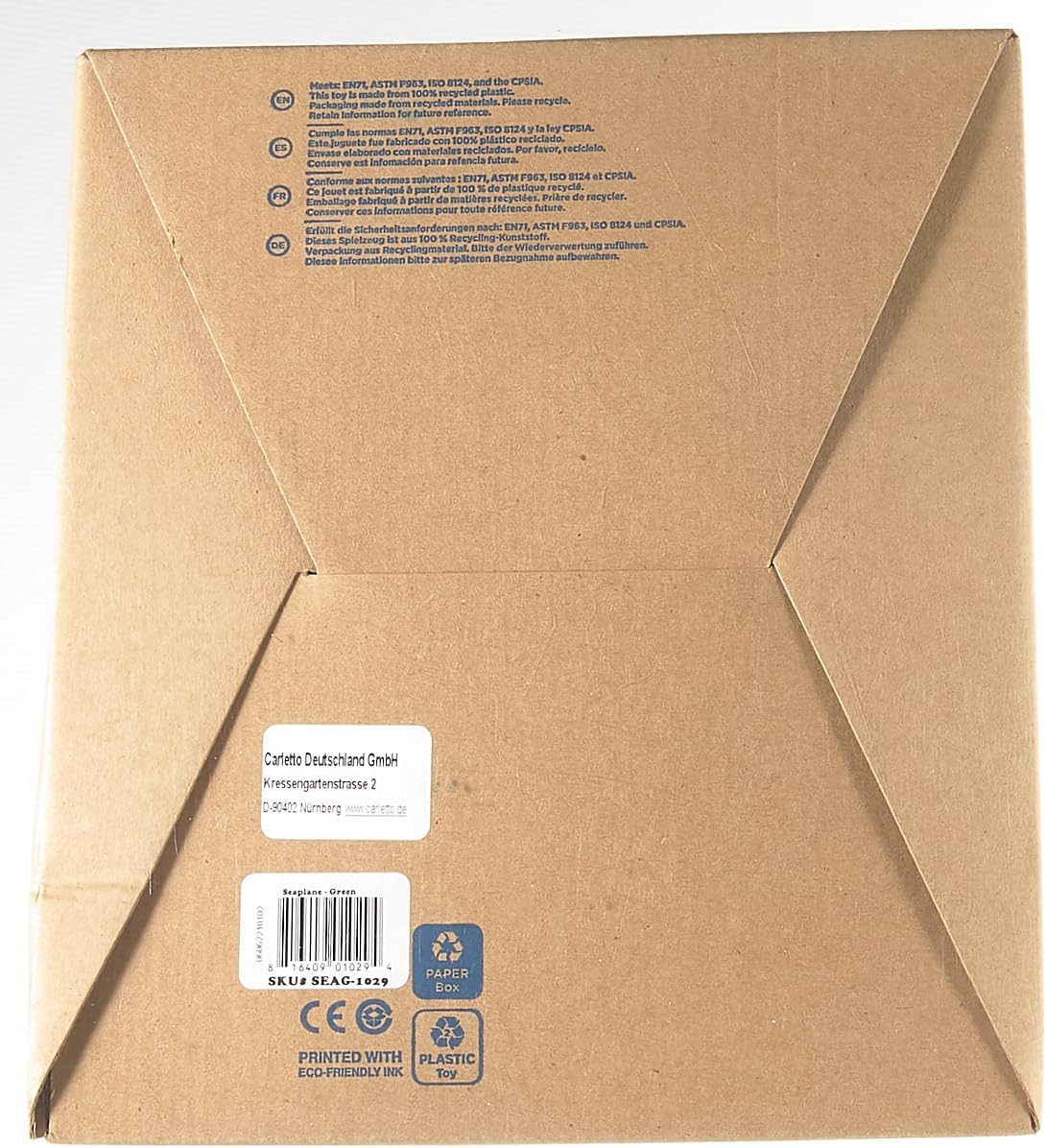 The seaplane is constructed entirely from recycled plastic, making it an environmentally friendly product. As sturdy and durable as toys come, it is designed to withstand rough play. The packaging is also made from recycled materials and contains no plastic twists, ties, or films.