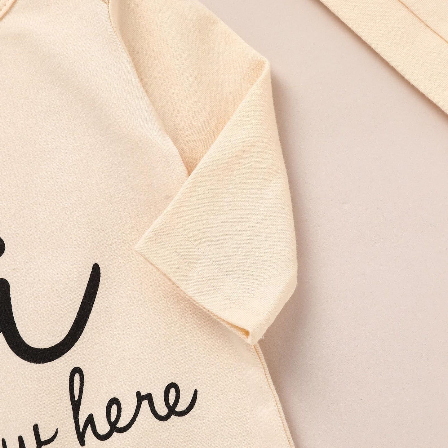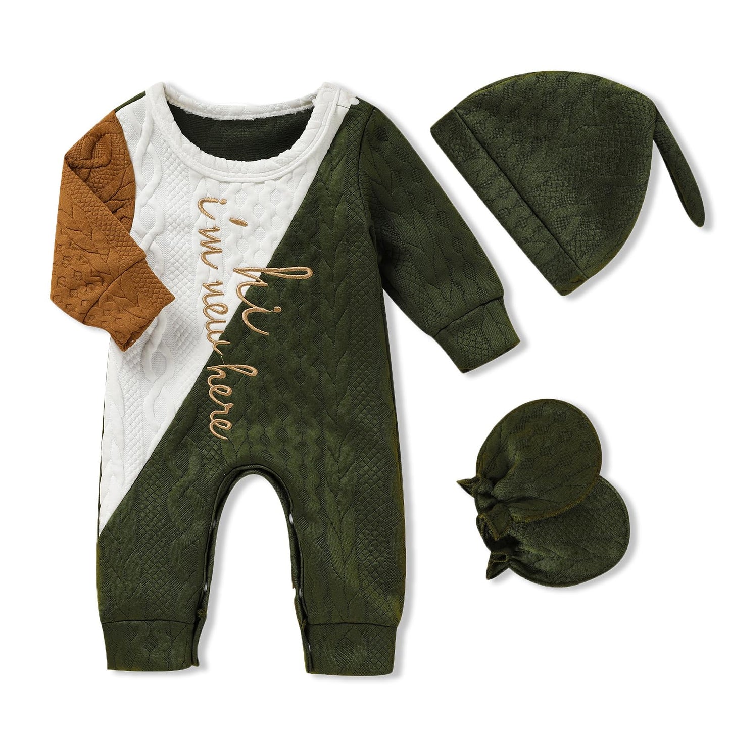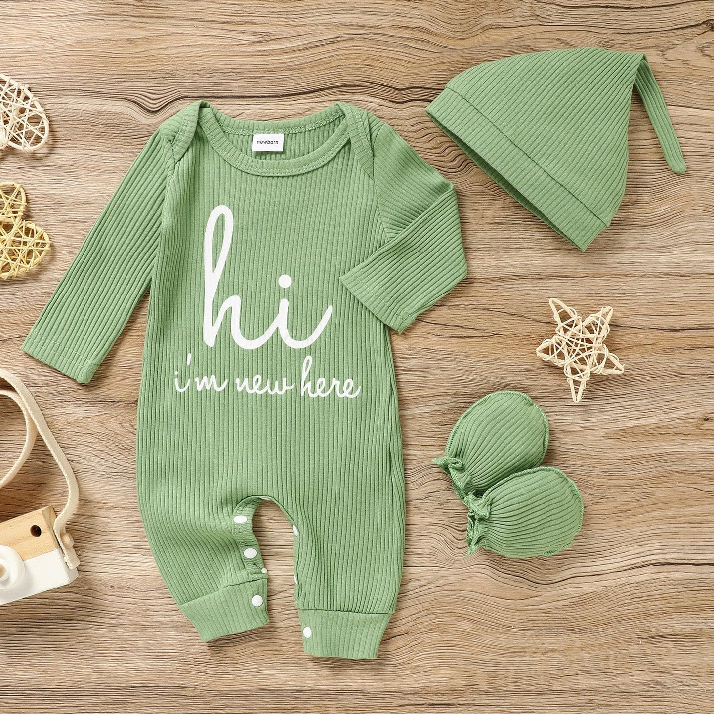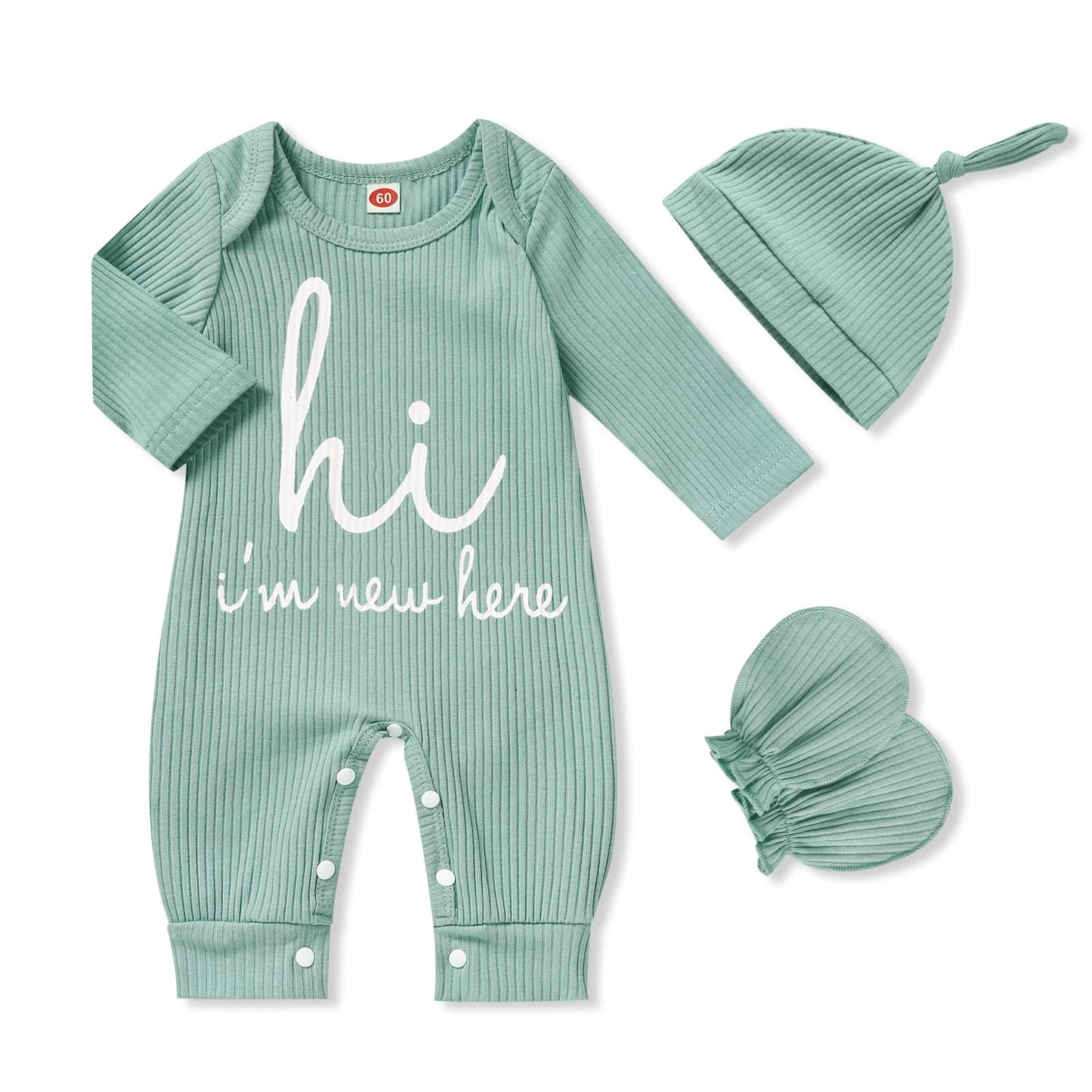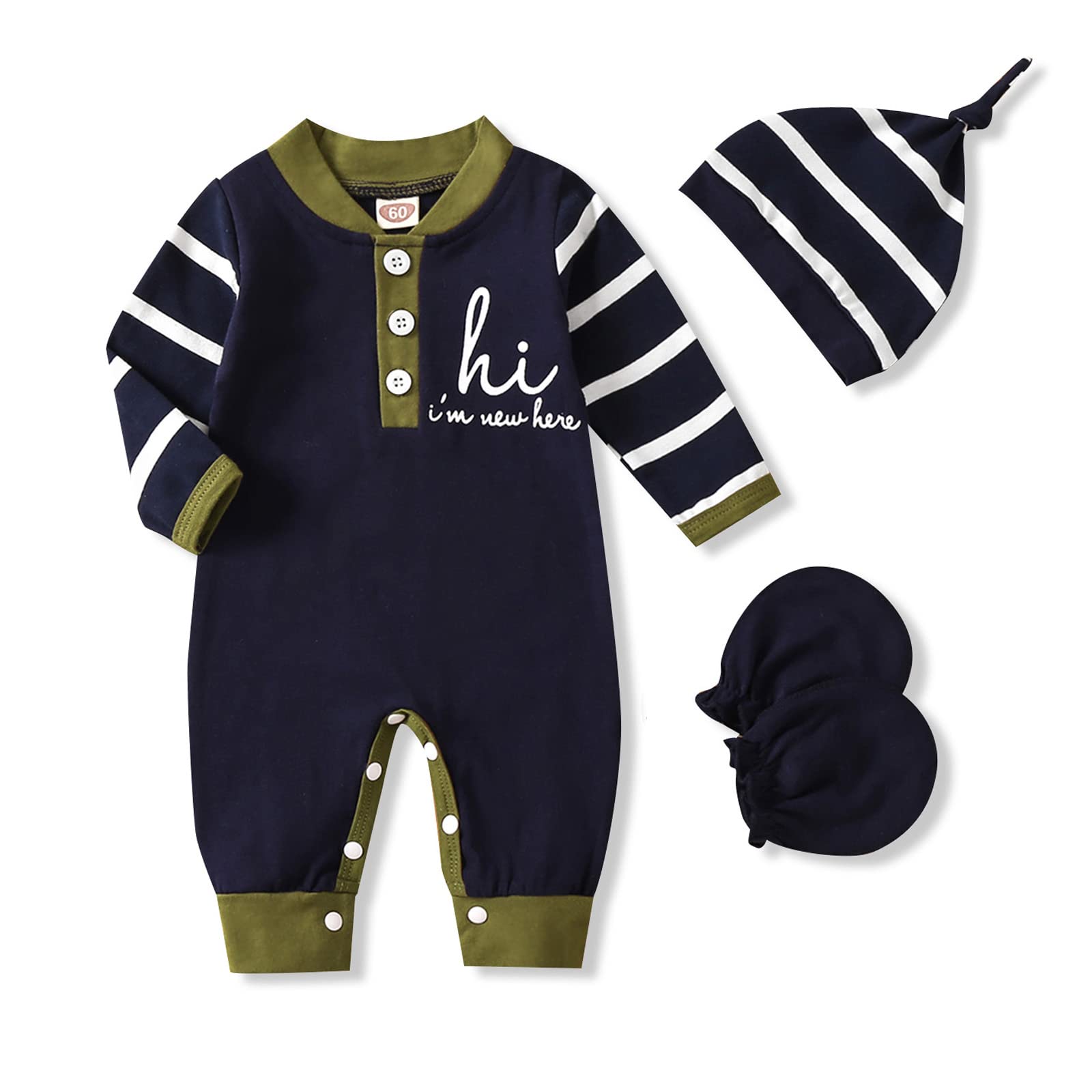 - 👼【UNIQUE DESIGNS】Newborn Baby Boy outfit jumpsuit with hat and gloves. Hi I m New Here letter printed Long sleeve romper. Convey the meaning of welcome.Snap diaper closure covered button, easy to wear. Hat protects baby's head. More adorable, and your little one will also get lots of compliments on it