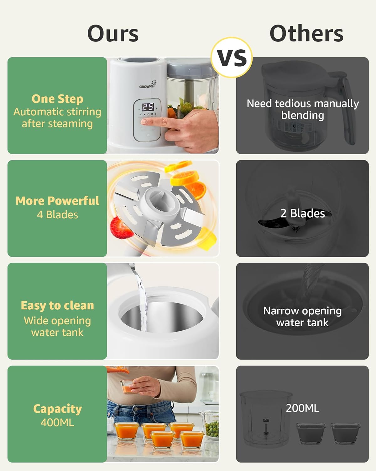 - šš²š®š¹ššµš šš²šš¶š“š» & šš¶š³š ššµš¼š¶š°:The Food container of this GROWNSY baby food puree maker is made of baby food grade PP material and the blades is made of 304 stainless steel, which is BPA-free and healthy for baby's growth. 400ML Large-capacity mixing containers can easily make a week's baby food. High-quality precision 4 blades to help you easily complete mixing. The water shortage function alerts you when the baby steamer is running out of water. Great gifts for Baby Showers.