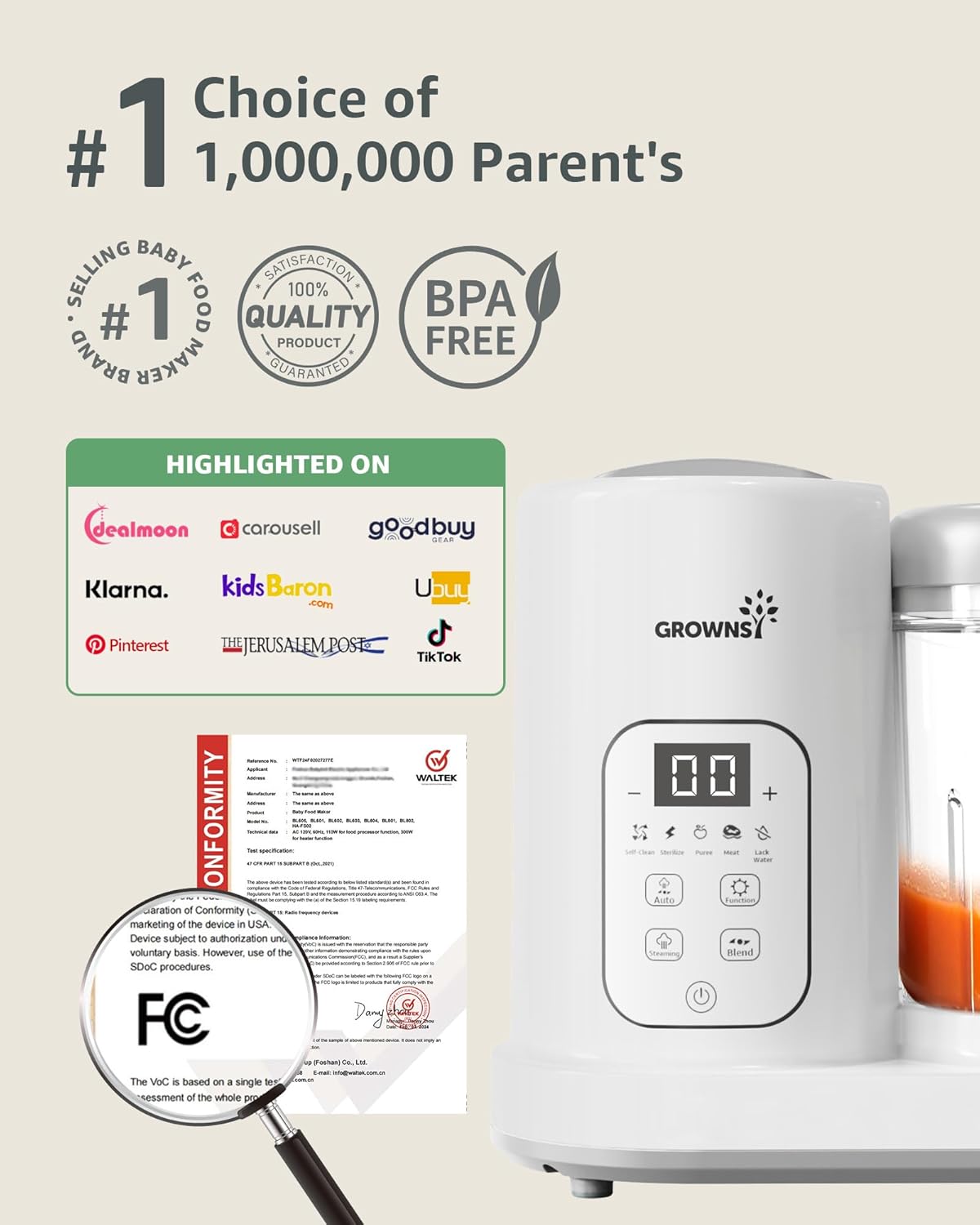 GROWNSY Baby Food Maker | Baby food Processor | All-in-One Baby Food Puree Blender Steamer Grinder Mills Machine Auto Cooking & Grinding with Self Cleans Touch Screen LCD Display, BPA Free