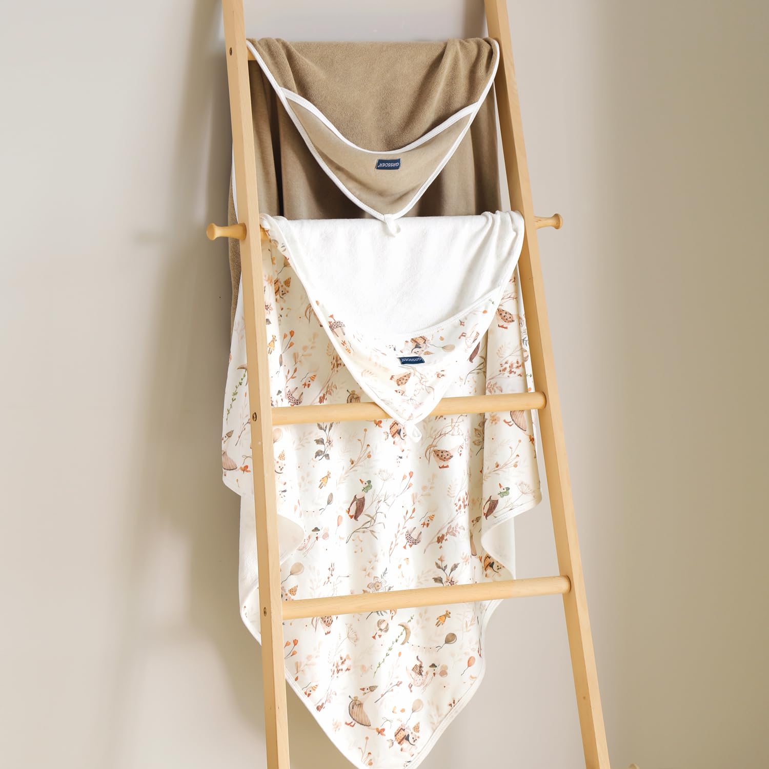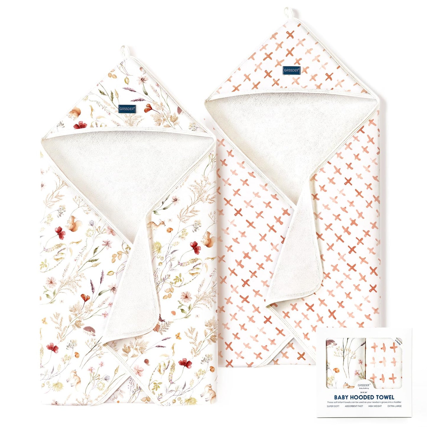 - Cute and Functional Design: Featuring cute, gender-neutral designs, GRSSDER baby towels set come with multiple original patterns and colors that bring a delightful experience for your baby. Our hooded towels are not only adorable but also practical. Super soft breathable material with hooded design keeps baby's head cozy, while the generous size is perfect for wrapping your baby in warmth and softness, just like a mother's embrace to make each bathing a tender moment.
