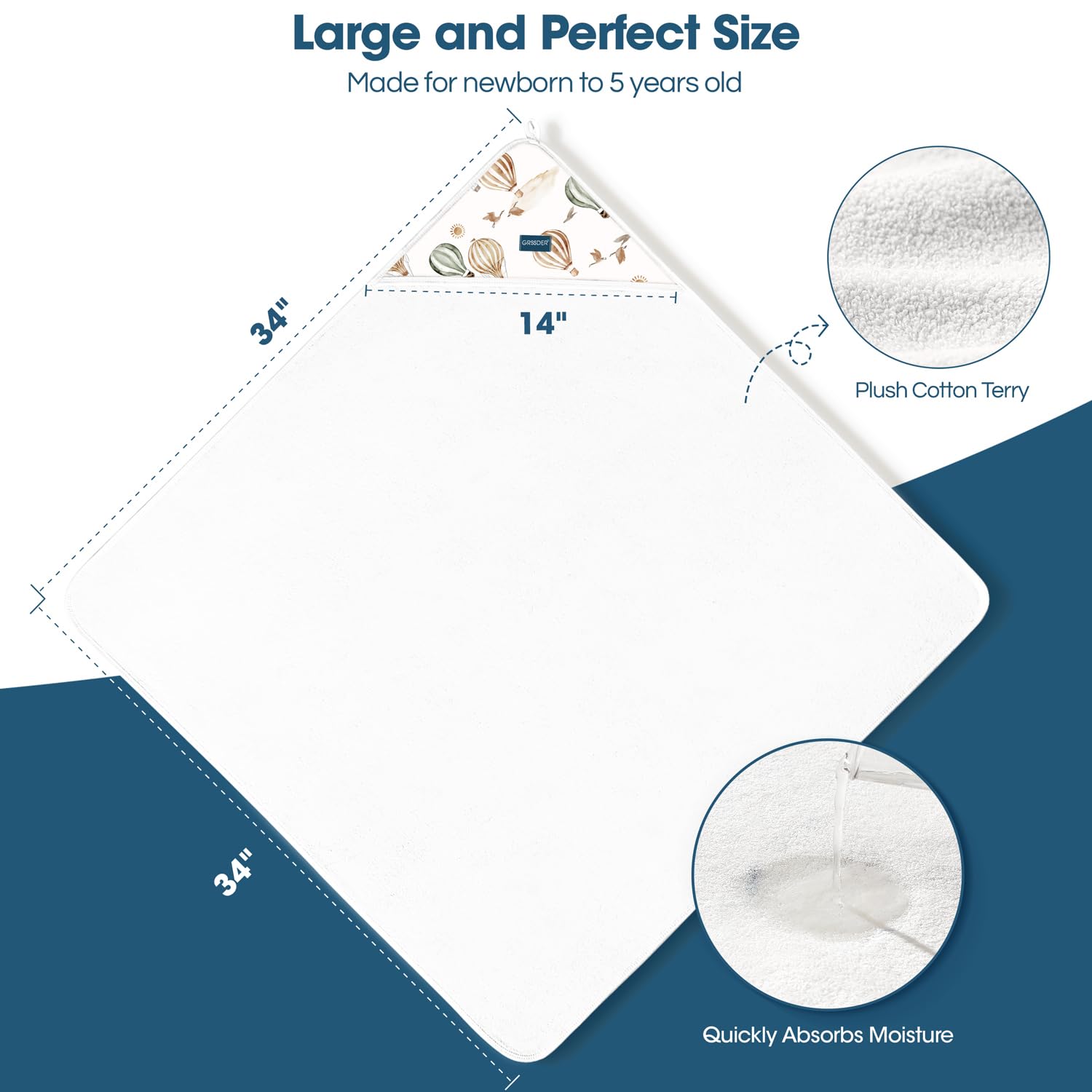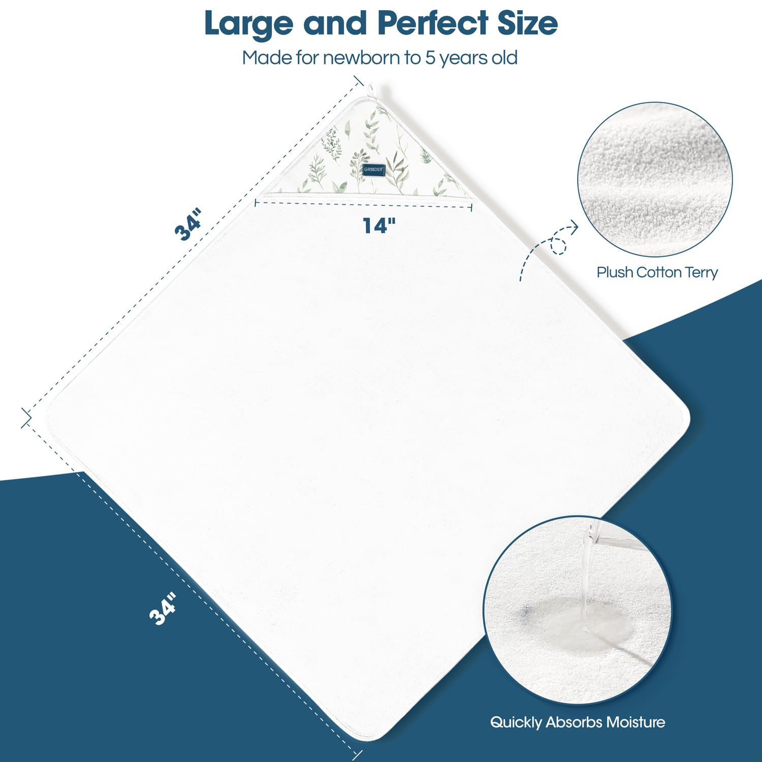 - Large and Perfect Size: Measuring 34" x 34", GRSSDER hooded baby towels are designed to be long-lasting, even with repeated washes. These soft infant towels can be used as your newborn grows into a toddler and up to age 5. Perfectly sized hood, not too large or deep so it does not cover baby's face.