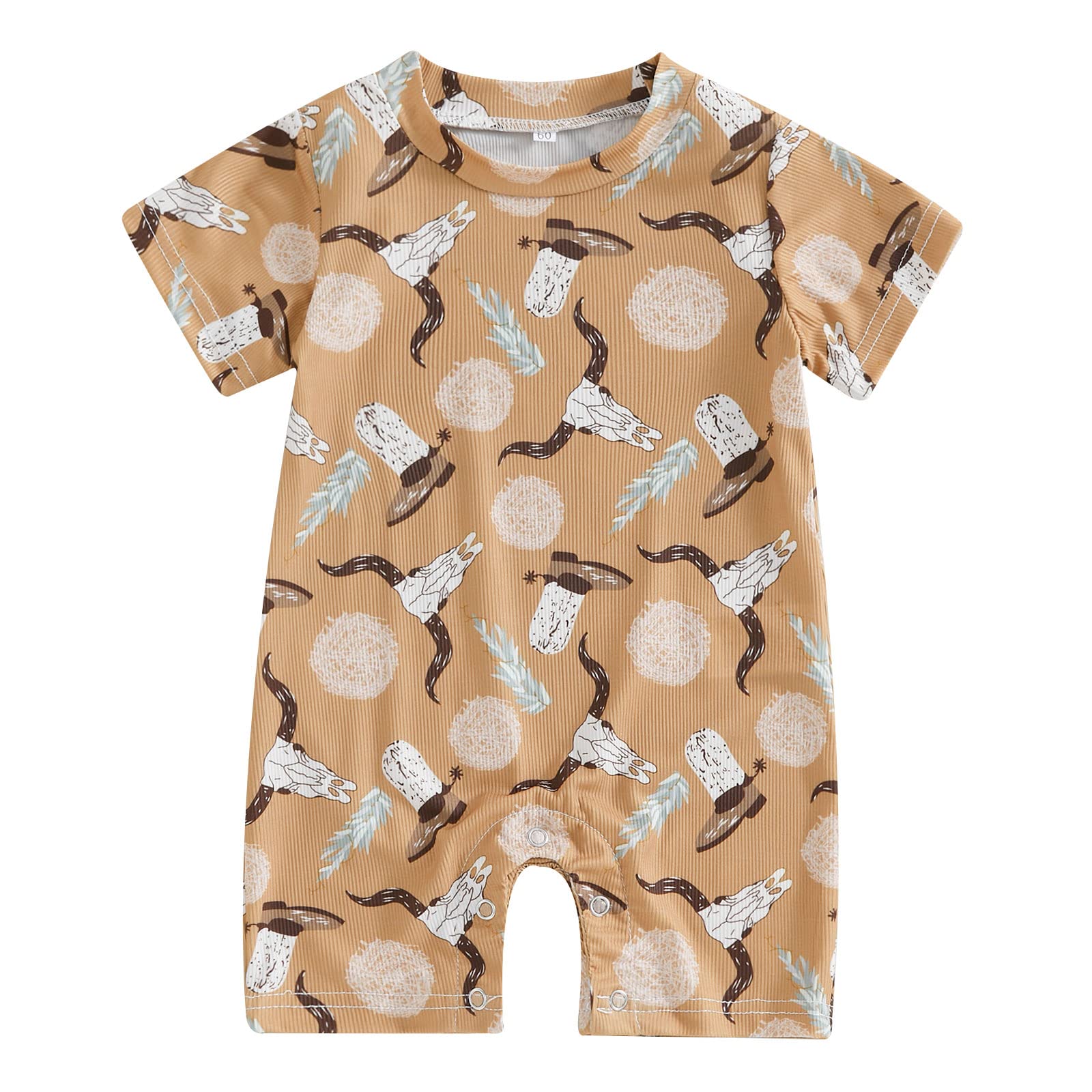 Gueuusu Country Baby Clothes Boy Girl Western Cow Print Short Sleeve Romper Bodysuit Ribbed One Piece Jumpsuit Summer Outfit
