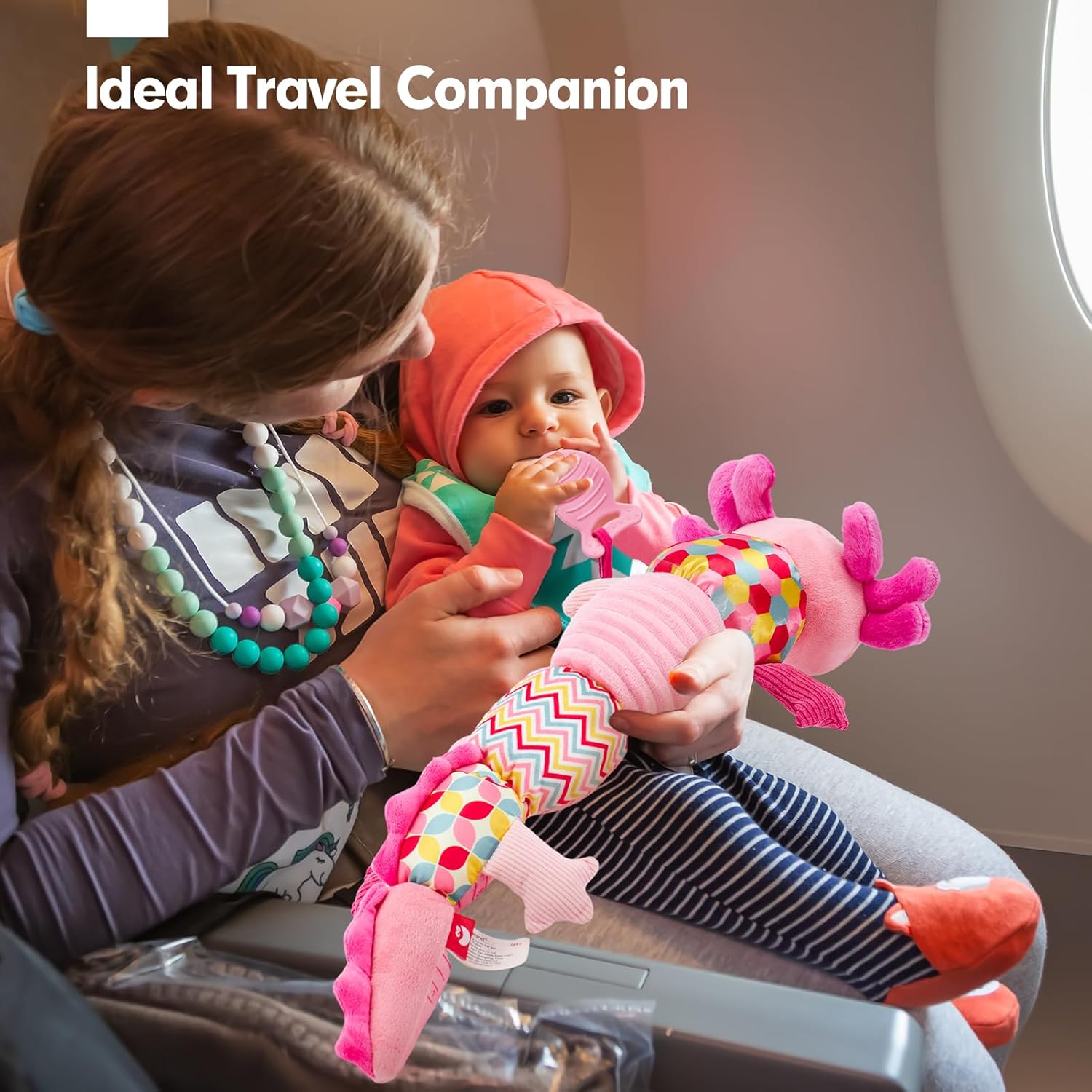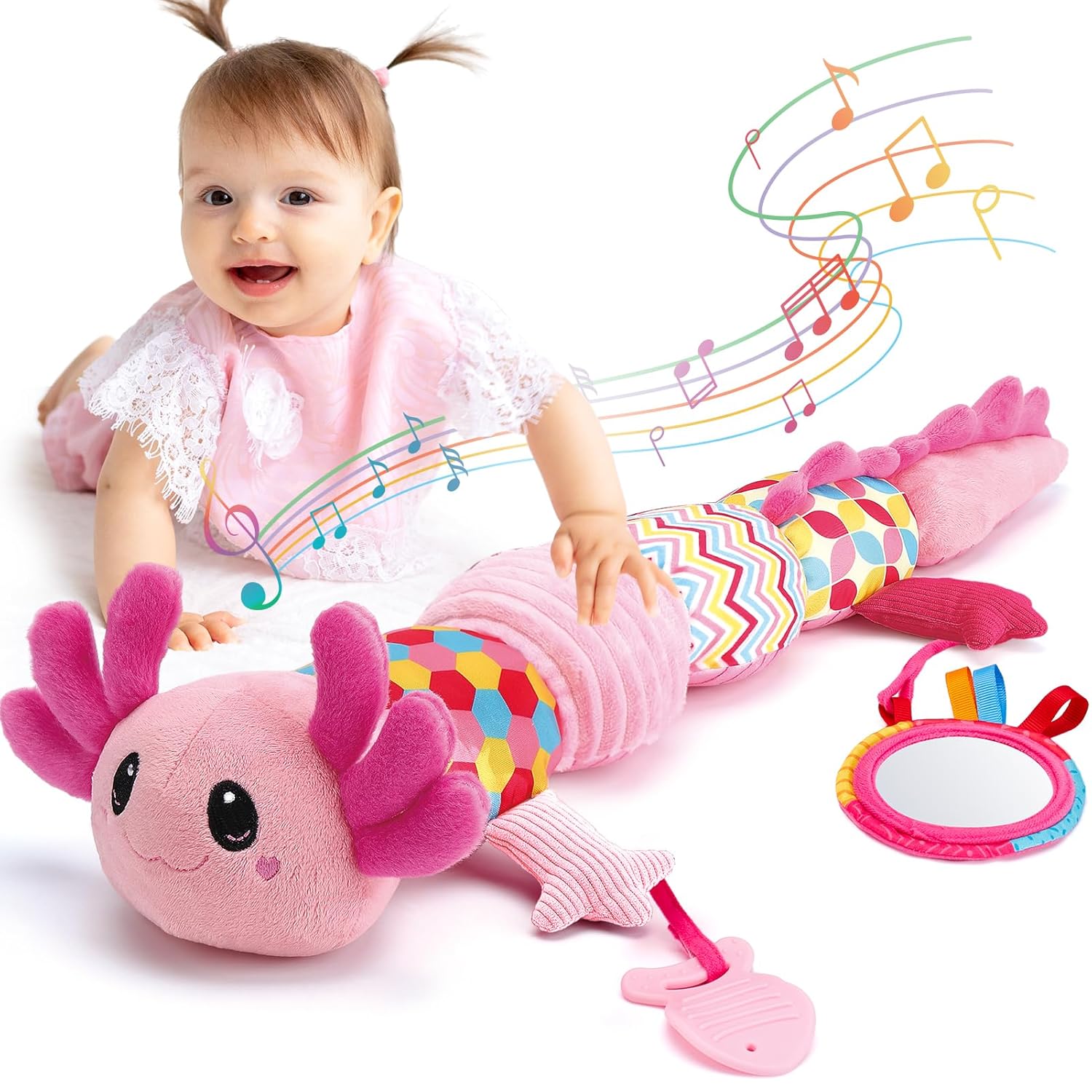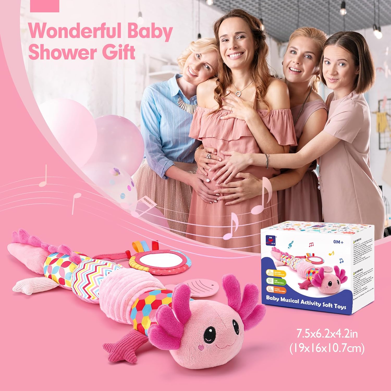 - Versatile Musical Soothing Axolotl: Our stuffed animal offers a plethora of sensory experiences including music, crinkly & squeaky sounds, mirror, rattle, and teether, making it perfect for car seats, cribs and strollers. Ideal for soothing babies during trips and diaper changes, providing a sense of security even during sleep