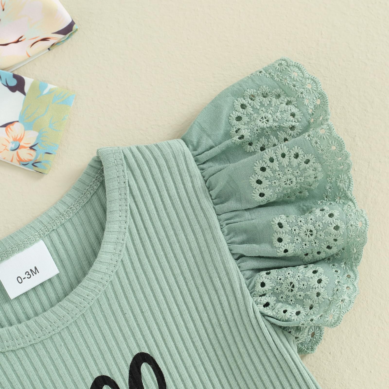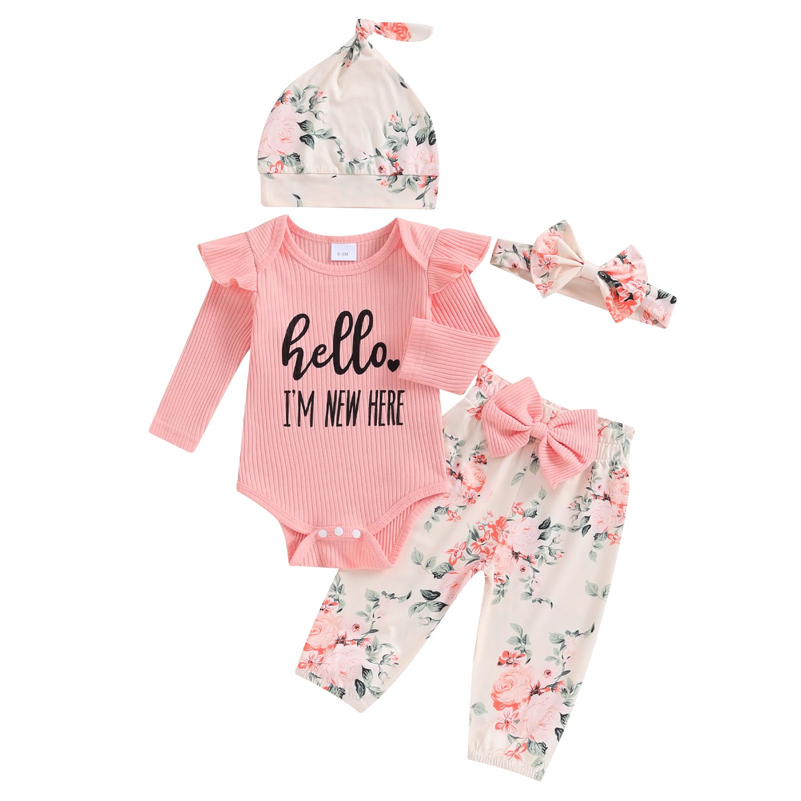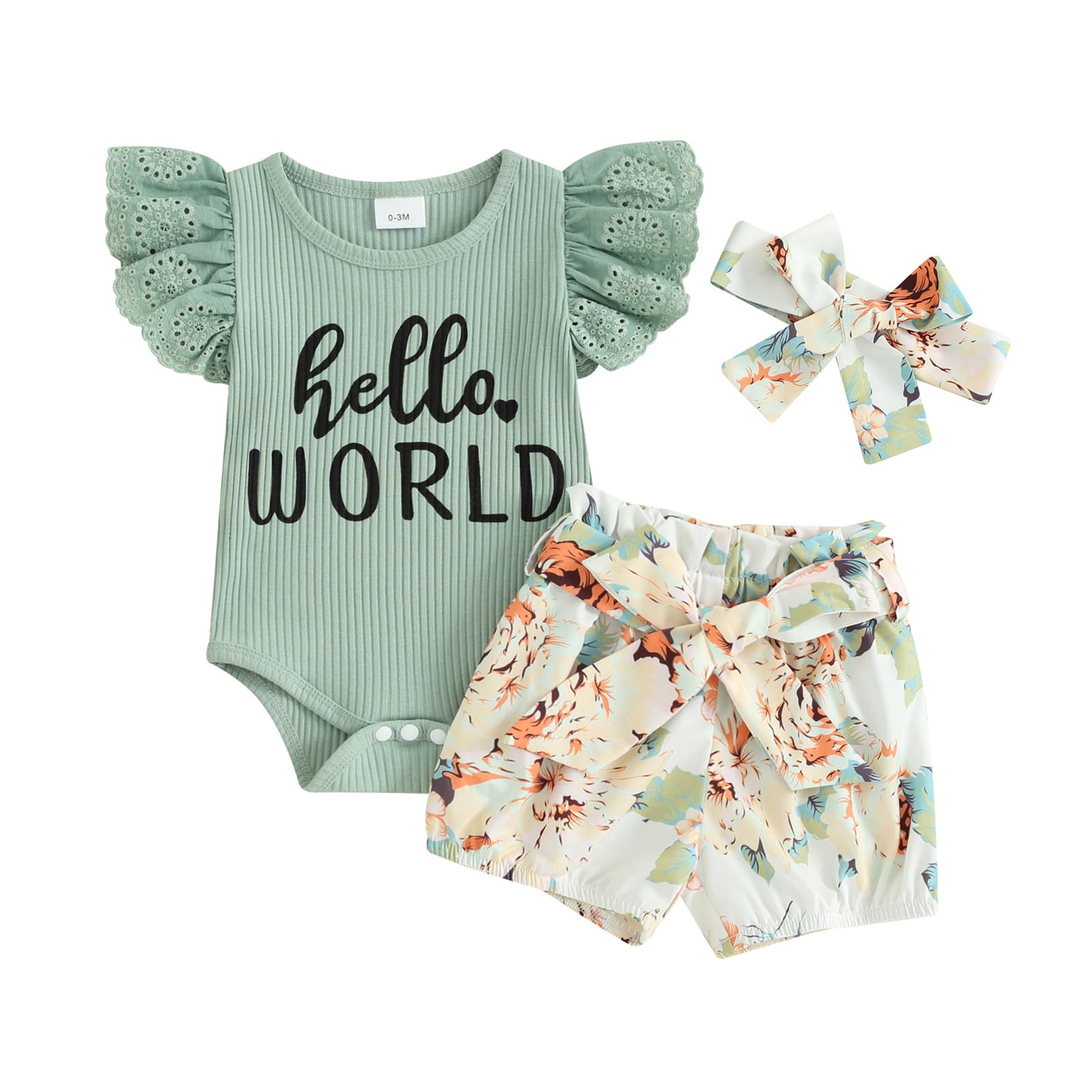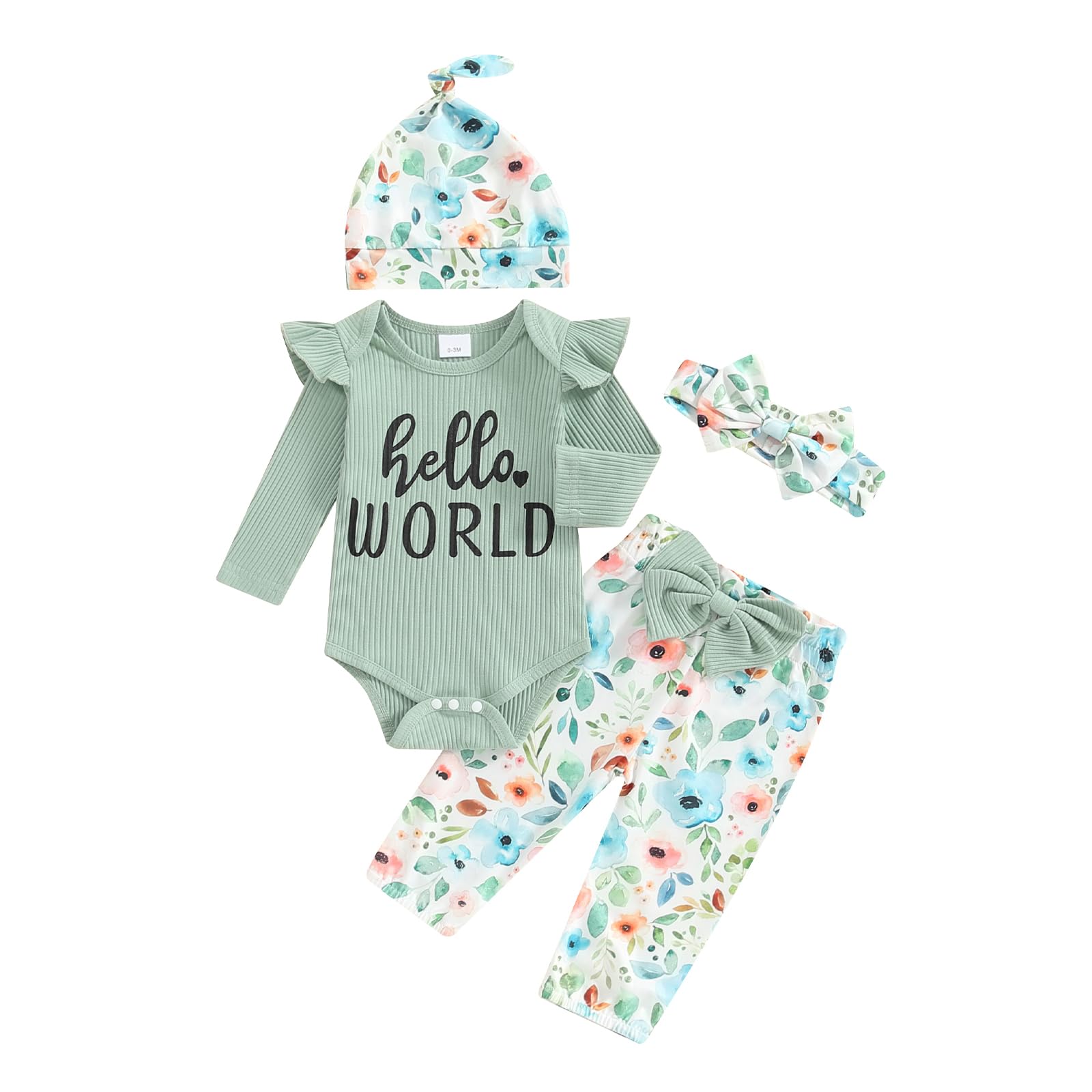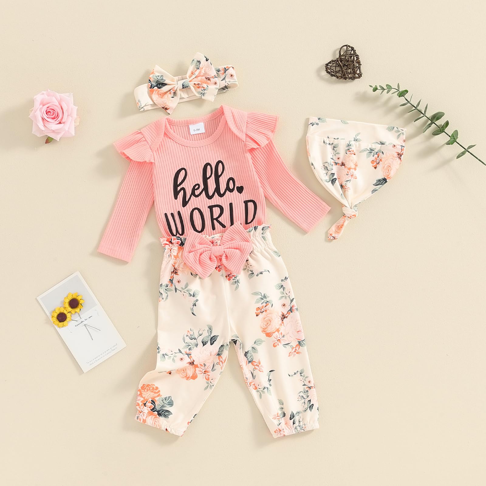 Hello World Newborn Outfit Baby Girl Going Home Outfit Ruffle Ribbed Romper Top Floral Pants Set Cute Summer Clothes