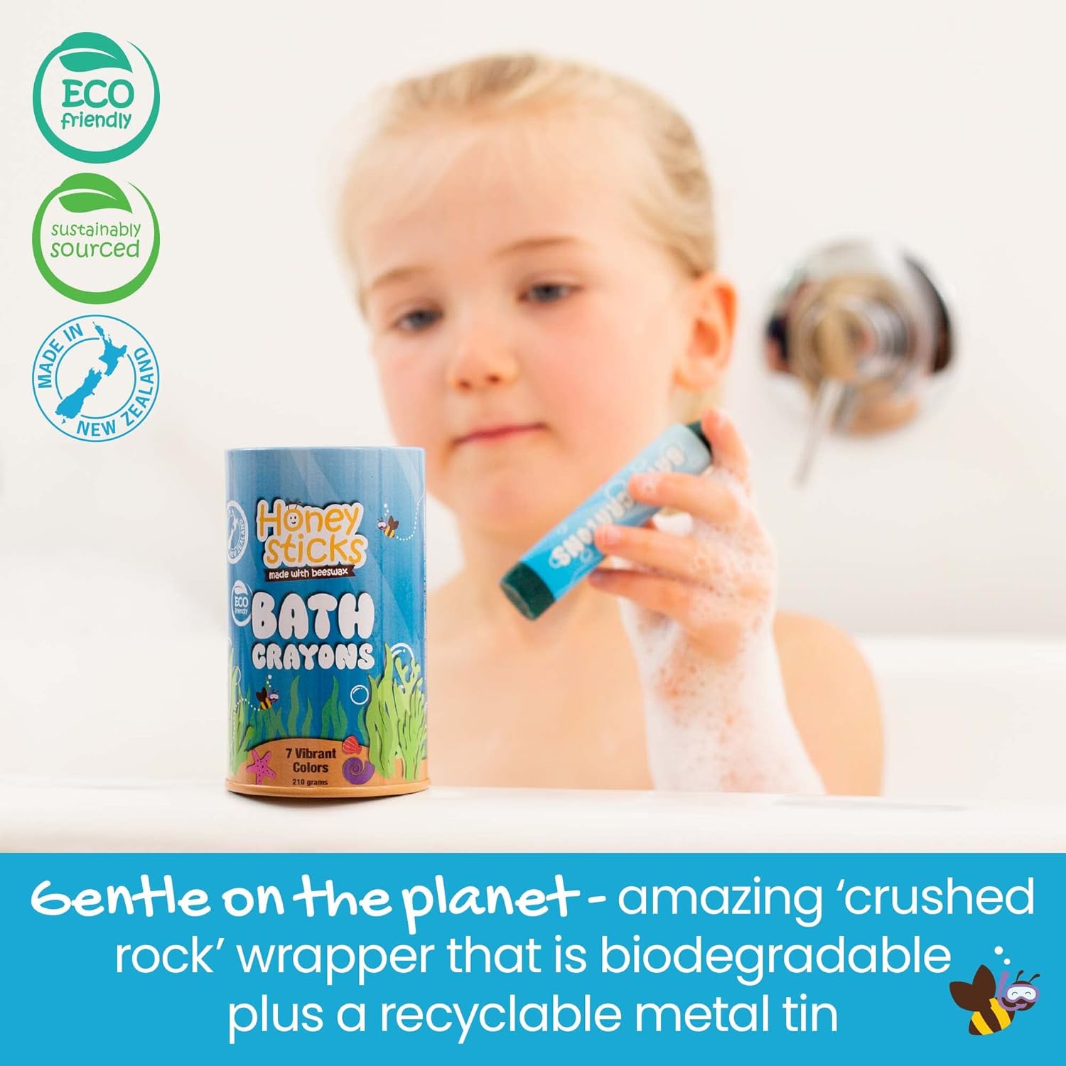 - GENTLE ON THE PLANET - Unlike others that are wrapped in plastic, Honeysticks Bath Crayons have a unique wrapper made from crushed rocks (how cool is that!). Packaged in a recyclable metal tin. Great eco friendly gift for kids that will be much loved by boys and girls alike.
