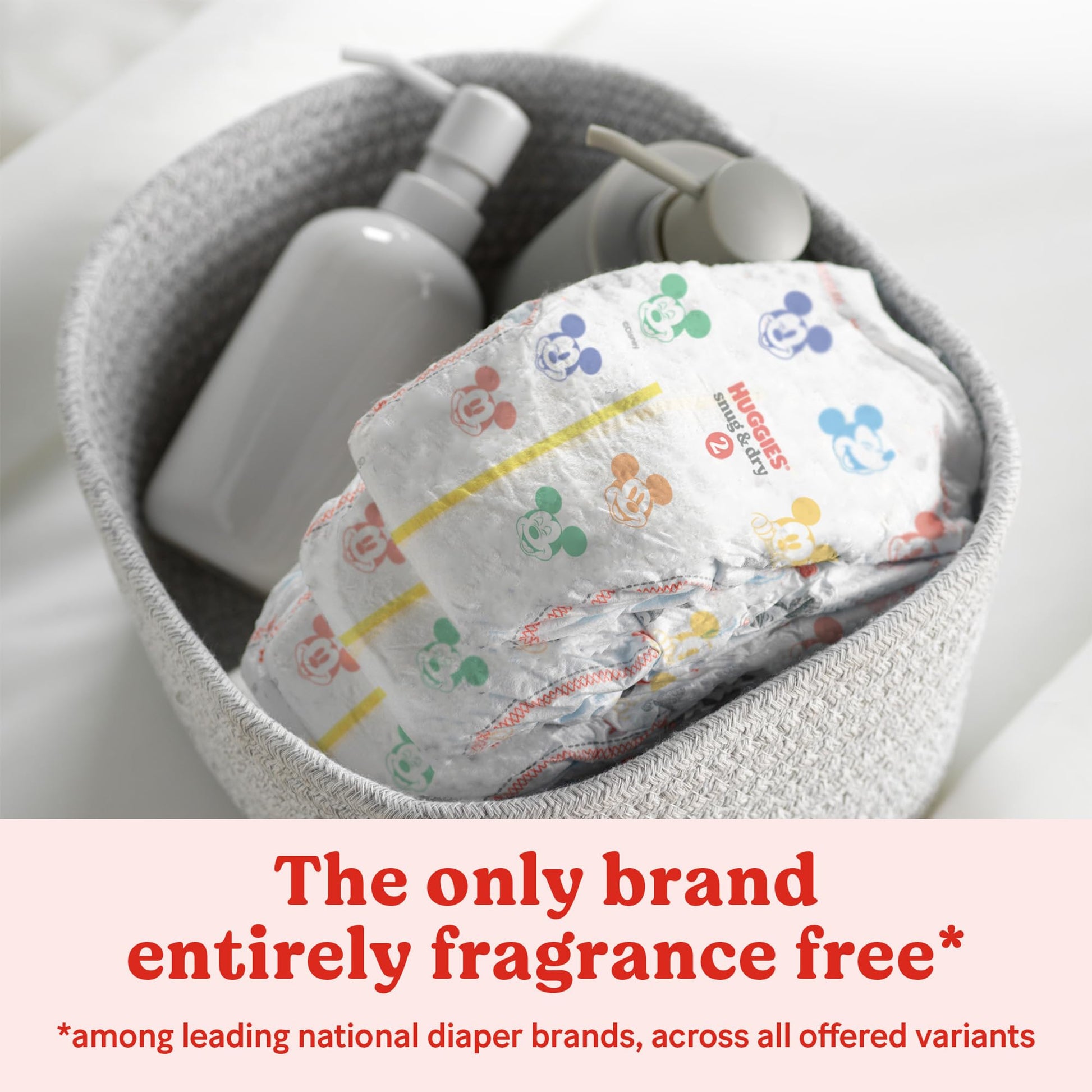Parenting might be hard, but thanks to Huggies Snug & Dry Baby Diapers, diapering doesn’t have to be. As the only leading brand that is entirely fragrance free,* Snug & Dry newborn diapers are made to be free of fragrances, added lotions, parabens and natural rubber latex. When it comes to keeping your baby dry, Snug & Dry diapers are there for you even in messy situations. Our Snug & Dry infant diapers are up to 100% leak proof, even from blowouts. Made with the original Leak Lock blowout blocker, Snug & Dry baby diapers help protect against blowouts and ensuing messes. Additionally, these diapers are designed with a curved and stretchy fit for outstanding leakage protection. Made to help your baby live their best life, our infant diapers feature 2X comfort design to provide outstanding softness and gentle protection. An added wetness indicator changes colors when the diaper is wet, allowing you to know right when the diaper needs to be changed. Featuring exclusive Disney designs, Huggies Snug & Dry Diapers are available in size Newborn (6-9 lb.), size 1 (8-14 lb.), size 2 (12-18 lb.), size 3 (16-28 lb.), size 4 (22-37 lb.), size 5 (27+ lb.), size 6 (35+ lb.), size 7 (41+ lb.) and size 8 (46+ lb.). (*among leading national diaper brands, across all offered variants) (**among branded open diapers. Excludes preemie size.)