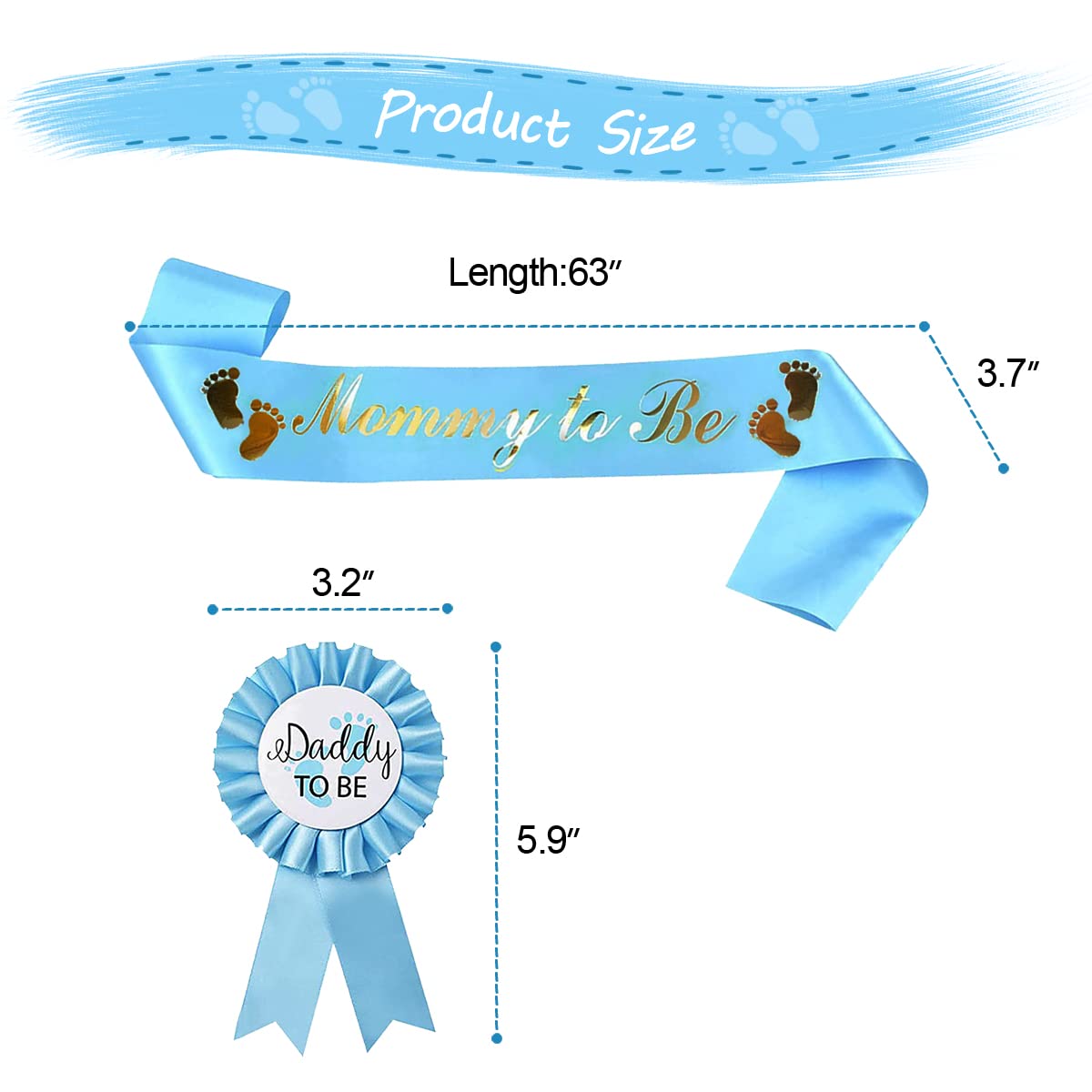 - Product Size: The mommy to be sash size is 63 inches long and 3.7 inches wide, universal size that fits most moms. And the daddy to be Badge size is 3.2x5.9 inches.
