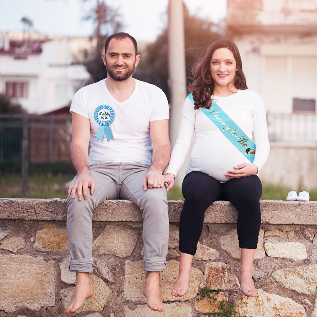 HUKONHEP 2 Packs Blue Baby Shower Sash, Mommy to Be Sash and Daddy to Be Badge, Baby Shower Decorations for Boys, Gender Reveals Gift