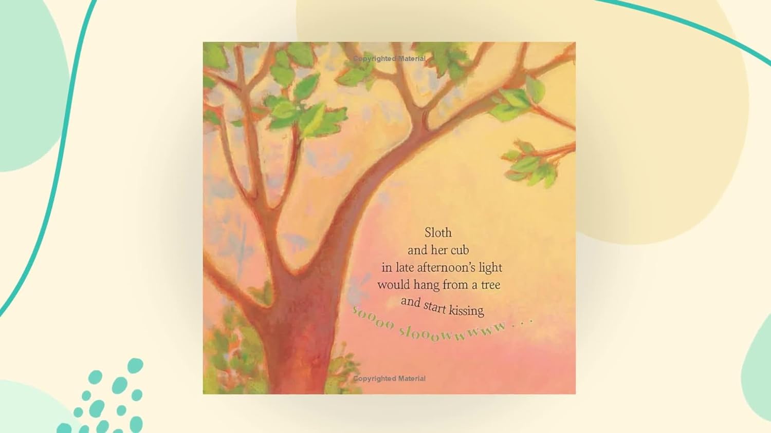 Giraffe and his calf would stretch their necks high, just beneath the top of the sky. Wolf and pup would kiss and then HOWL, while Bear and cub would kiss and then GROWL! And long after all the other animals have been tucked in tight? Sloth and her baby will still be saying night-night!