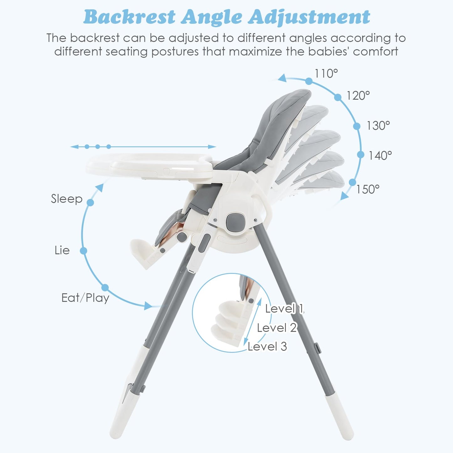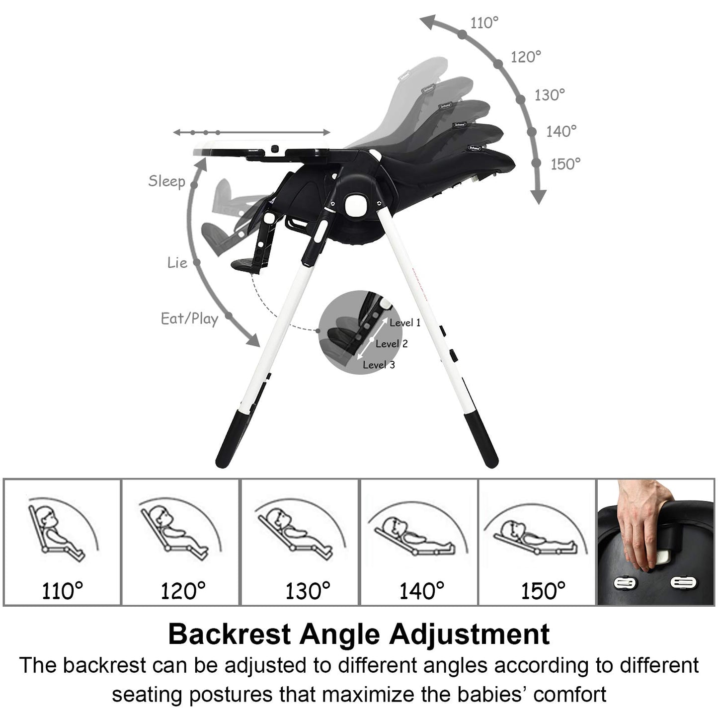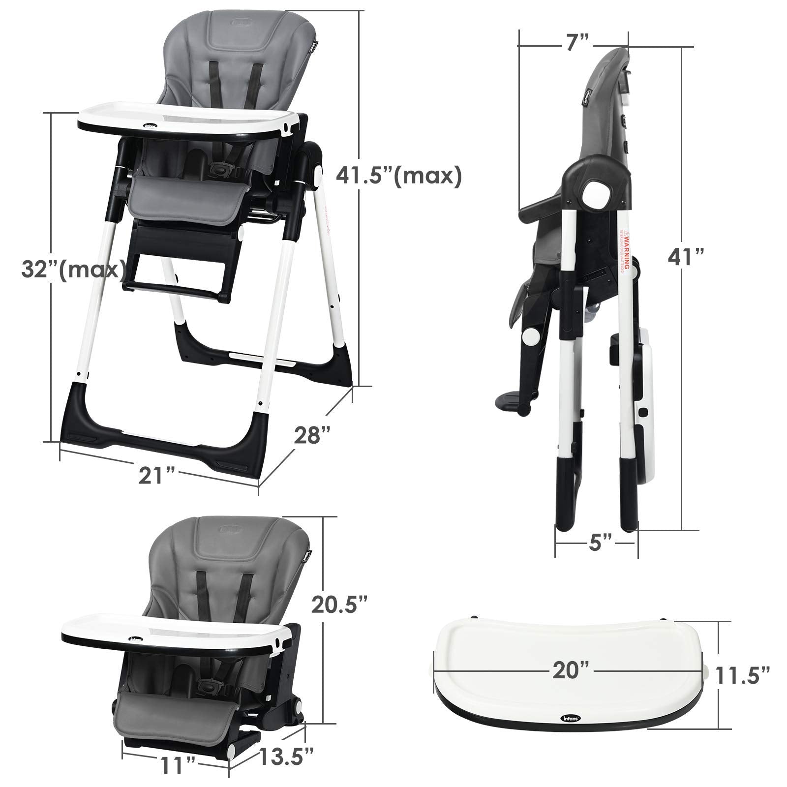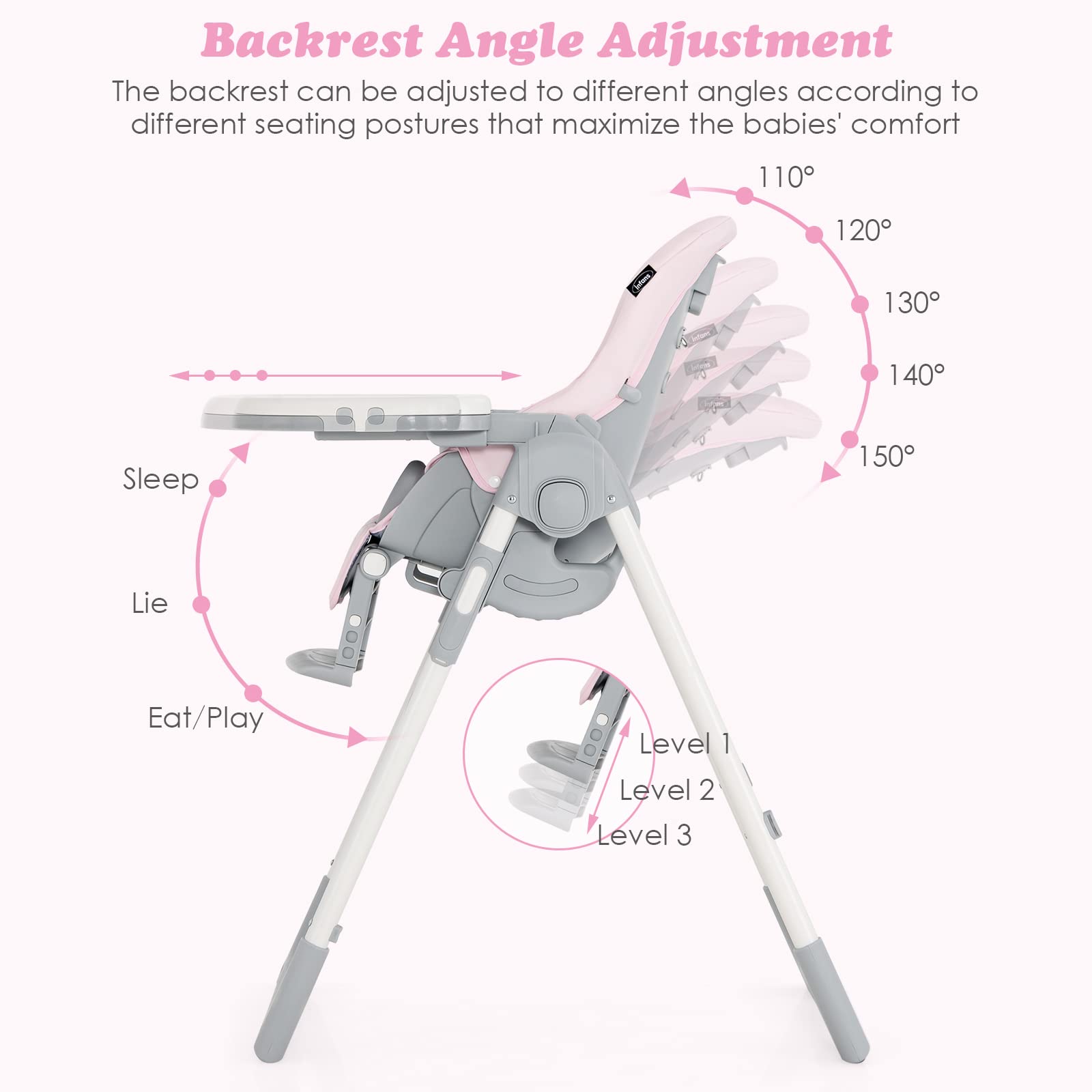 - HIGH CHAIR WITH MULTIPLE ADJUSTABLE: Different with traditional high chair, our baby highchair has a multiple adjustable frame. The backrest is provided with 5 adjustable positions which is ideal for different use needs. And the footrest can also be adjusted into 3 different positions to meet baby’s postures. The length of footrest has 3 levels to fit your baby's body. The trays have 3 adjustable positions and the trays are also easily detachable when you don’t need.