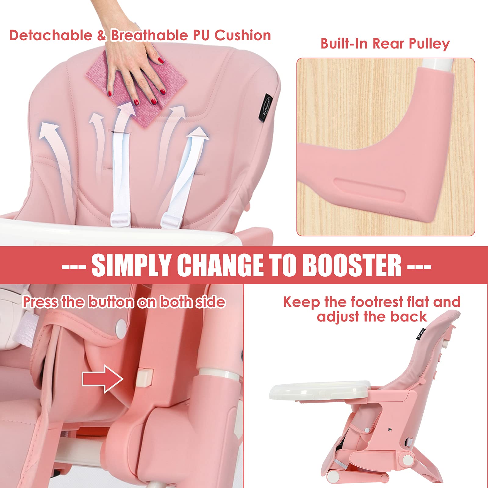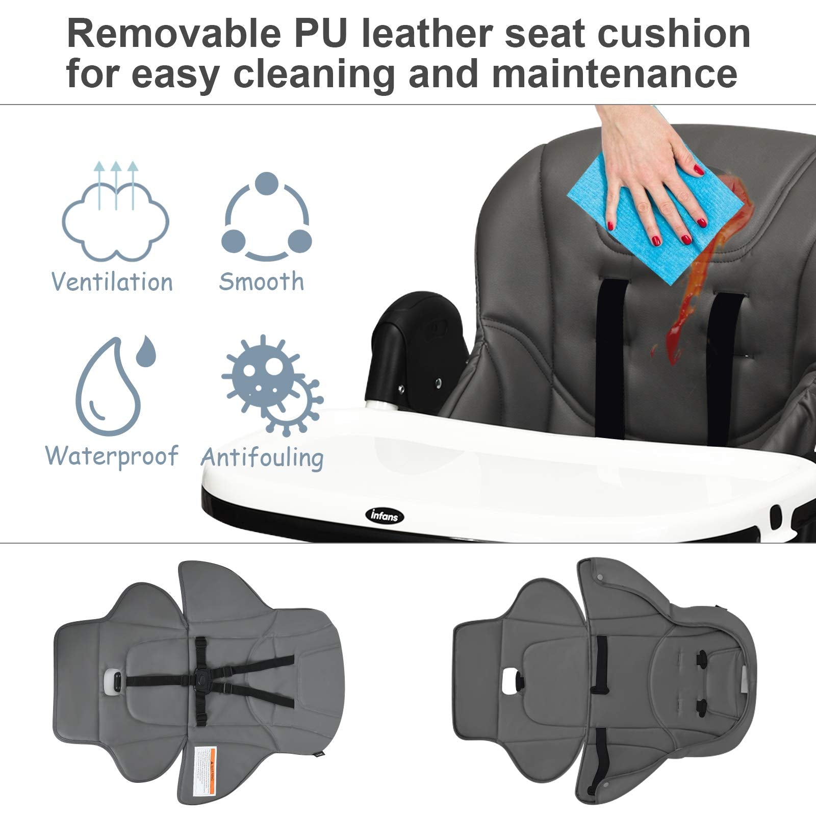 - EASY TO CLEAN WITH DETACHABLE DESIGN: Cleanliness has always been a top concern for baby products. Contact with detachable trays and seat cushion, our baby high chair is easy to clean and maintain after daily use. The removable PP top tray is also dishwasher safe. And the PU leather cushion is waterproof that you just need to wipe the smudges with a clean cloth. 5-point safety harness ensures security for your little baby. All the corners of our baby highchair are smooth without sharp edges.
