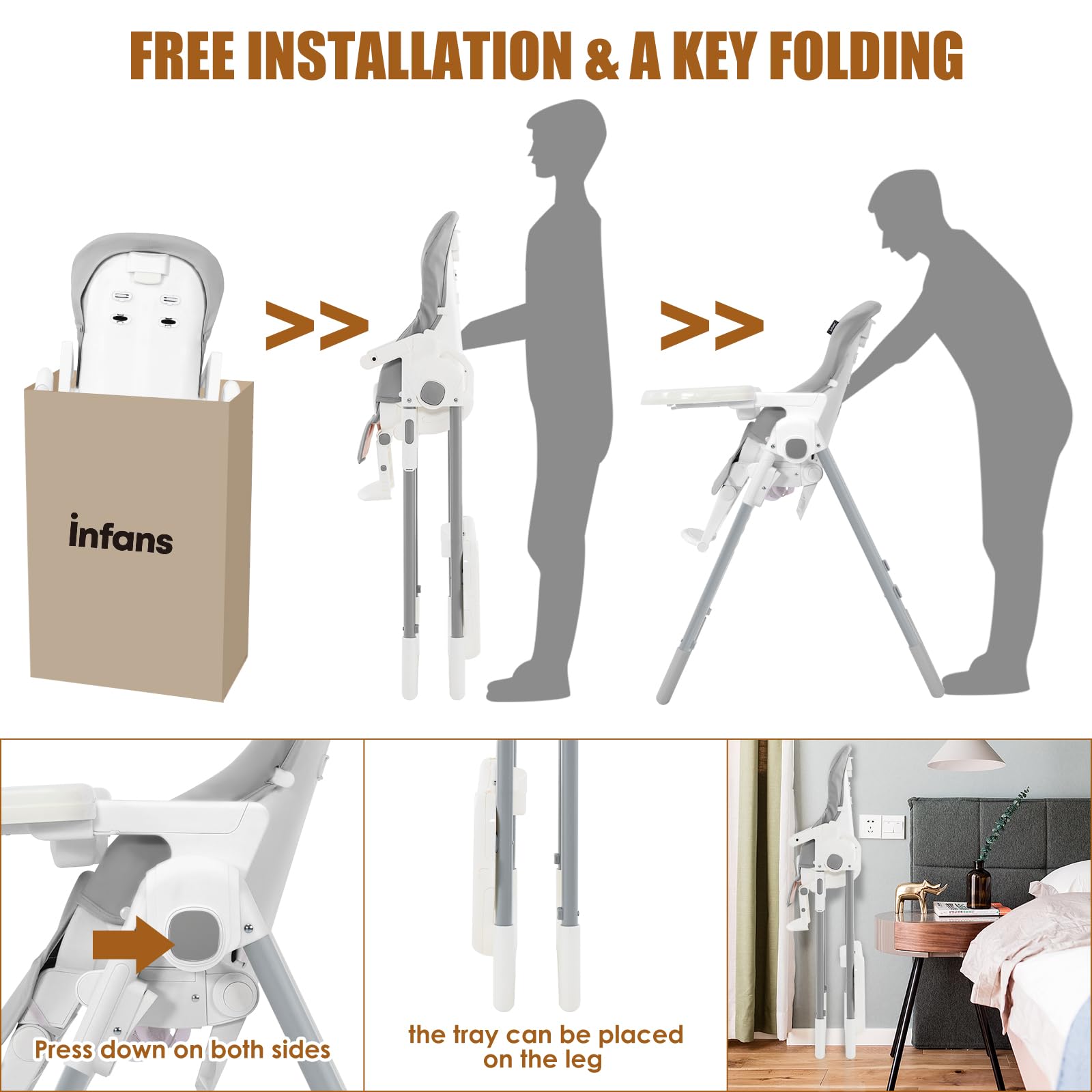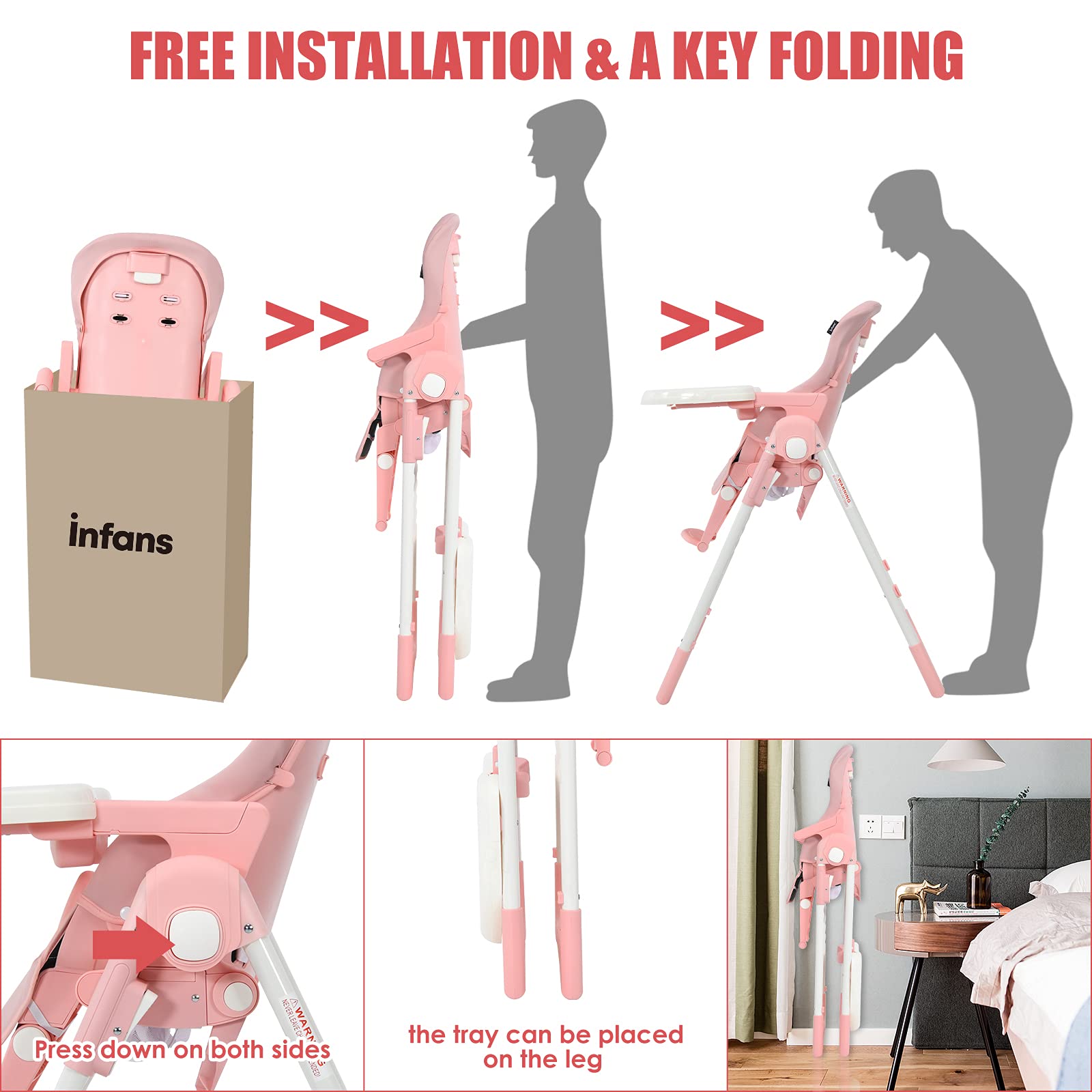 - FREE INSTALLATION WITH FOLDABLE STRUCTURE: How to storage things are often be the daily trouble for the families which have babies. Our high chair have scientific frame to fold for easily storage. The detachable trays also can be fixed on the legs for space saving. The highchair can stand freely after fold without additional support. No installation required is ideal for convenient use to save time and energy. There are two built-in rear wheels, mobile more convenient.