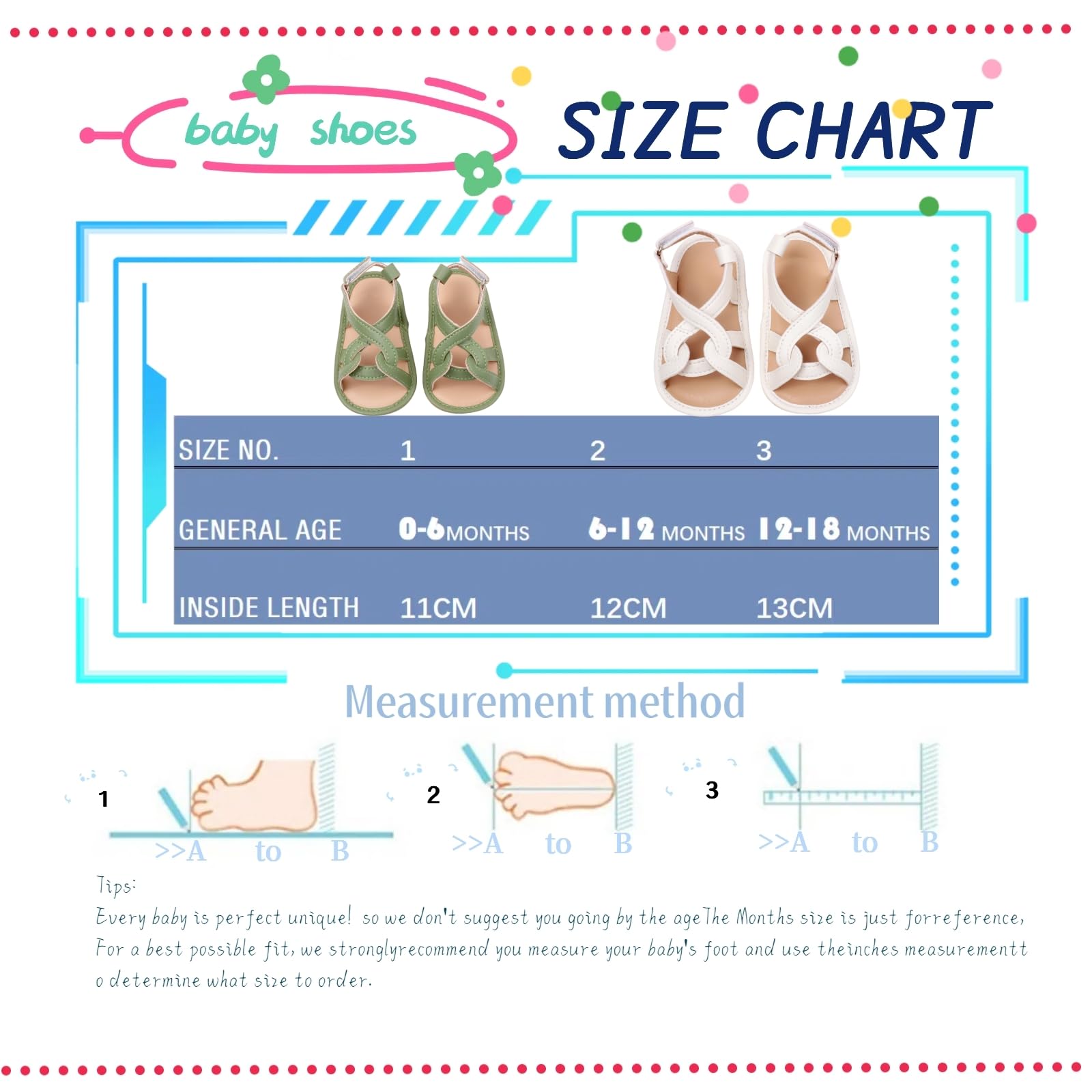 - NEWBORN SUMMER SANDALS TIPS:These Sandals for babies 0-18 Months,but the babies shoes age are just for reference, every baby is unique, so don't suggest you going by the age, please use inch measurements to choose the size to order baby shoes will be perfect for your babies actual foot