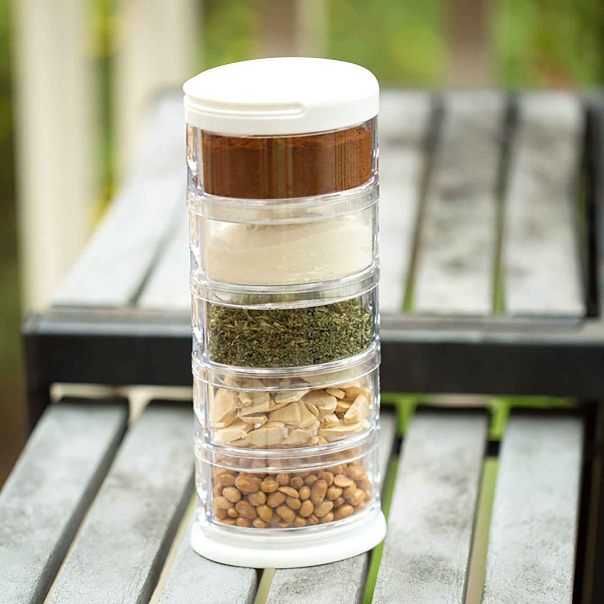 - EASY to USE - Each container is securely stacked together until ready to use with our patented secure-click system. Access the container in need by pressing the oval imprints on each side. Removable funnel shaped inner lids make spilling the entire contents very difficult.