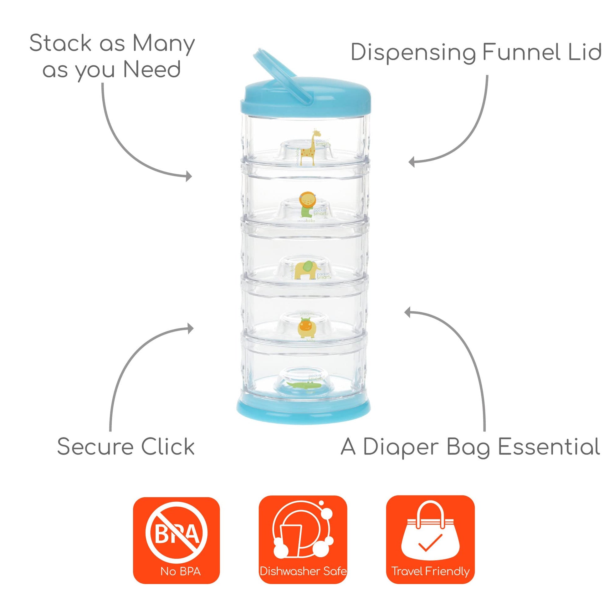 - CAN STACK AS MANY CONTAINERS AS YOU NEED – With interchangeable lids, bases and containers, you can have as many or as few as you need. This set comes with 5 containers, 5 inner lids, 1 cap, and 1 base. Each container holds up to 1/3 cup or 8 oz. of powdered formula.