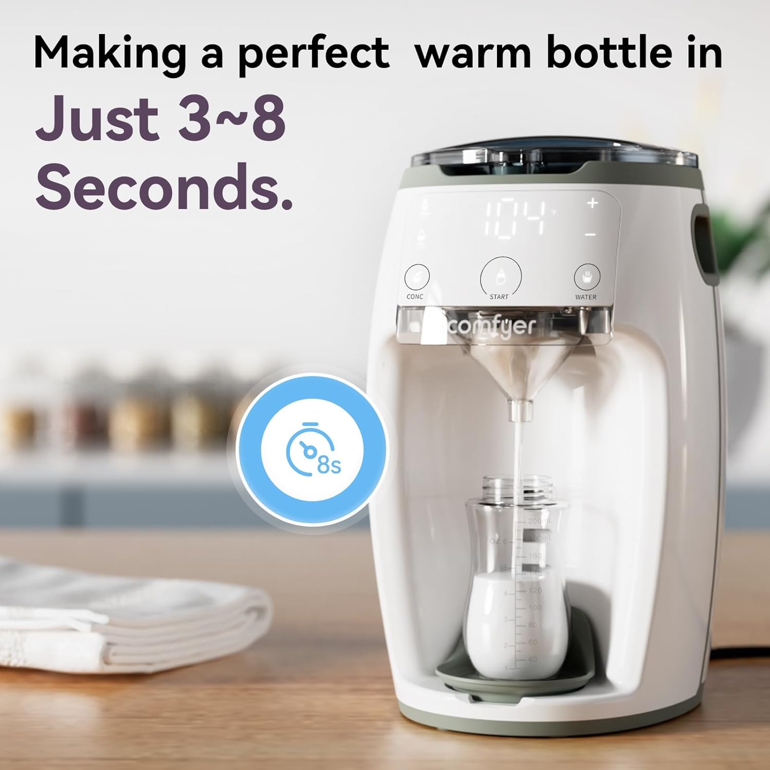 - 【MAKING A PERFECT BOTTLE IN 3-8 SECONDS】comfyer baby formula maker helps faster and more timely feeding and soothing little ones, giving moms peace of mind. Innovative Mixing tech ensure accurate concentration, effectively avoiding bubbles and formula powder clumping, preventing discomfort in babies. Instant water heating tech provides fresh hot water for ready-to-use, more healthier. comfyer electric formula dispenser machine prepares a warm bottle in 8 seconds! Food-grade approved.