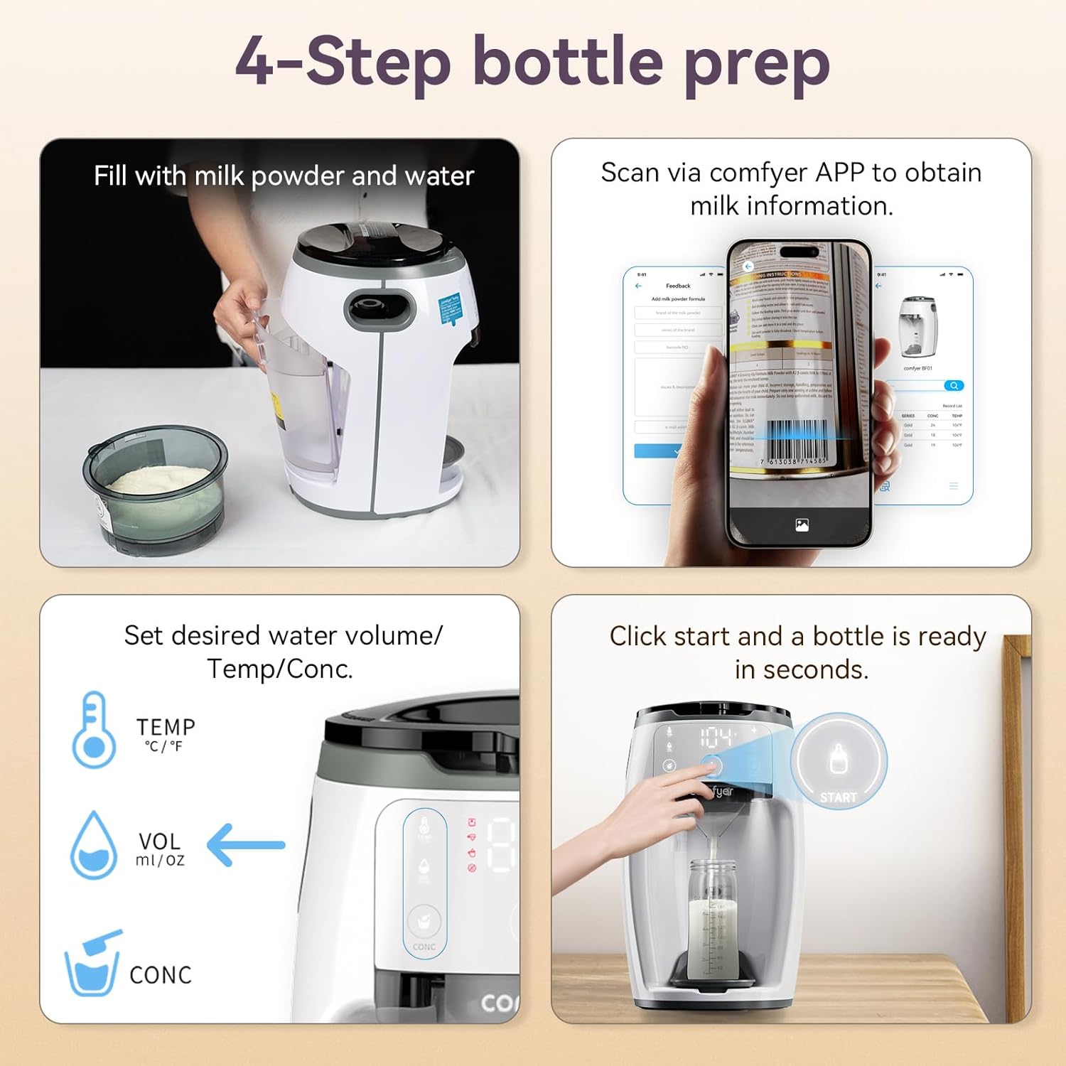 Comfyer's automatic milk machine amazingly quick prepare a perfect bottle in 3-8 seconds, soothing Babies timely and giving moms peace of mind. Food-grade approved, BPA free.