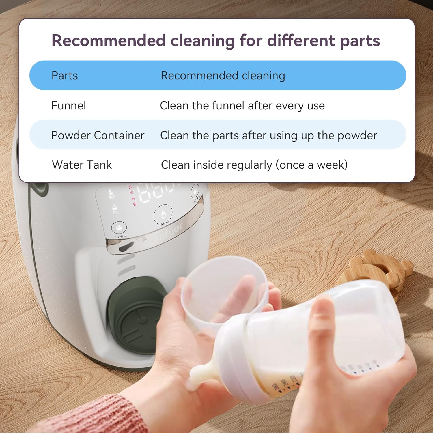 To ensure babies drinking safely and maintain hygienic of key milk-prep parts, please clean the funnel after each use; powder nozzle once a day (replacement parts are available, sold separately); Water tank and milk powder cannister can be cleaned in water below 104°F after using up to avoid deformation.