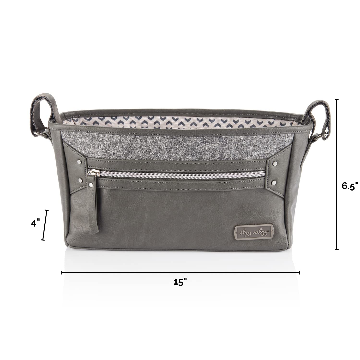 - EXTERNAL ZIPPERED POCKET: Itzy Ritzy understands the importance of keeping parent essentials close at hand. Our stroller caddy features an external zippered pocket on the front, providing a secure space for your phone, keys, and other personal items.