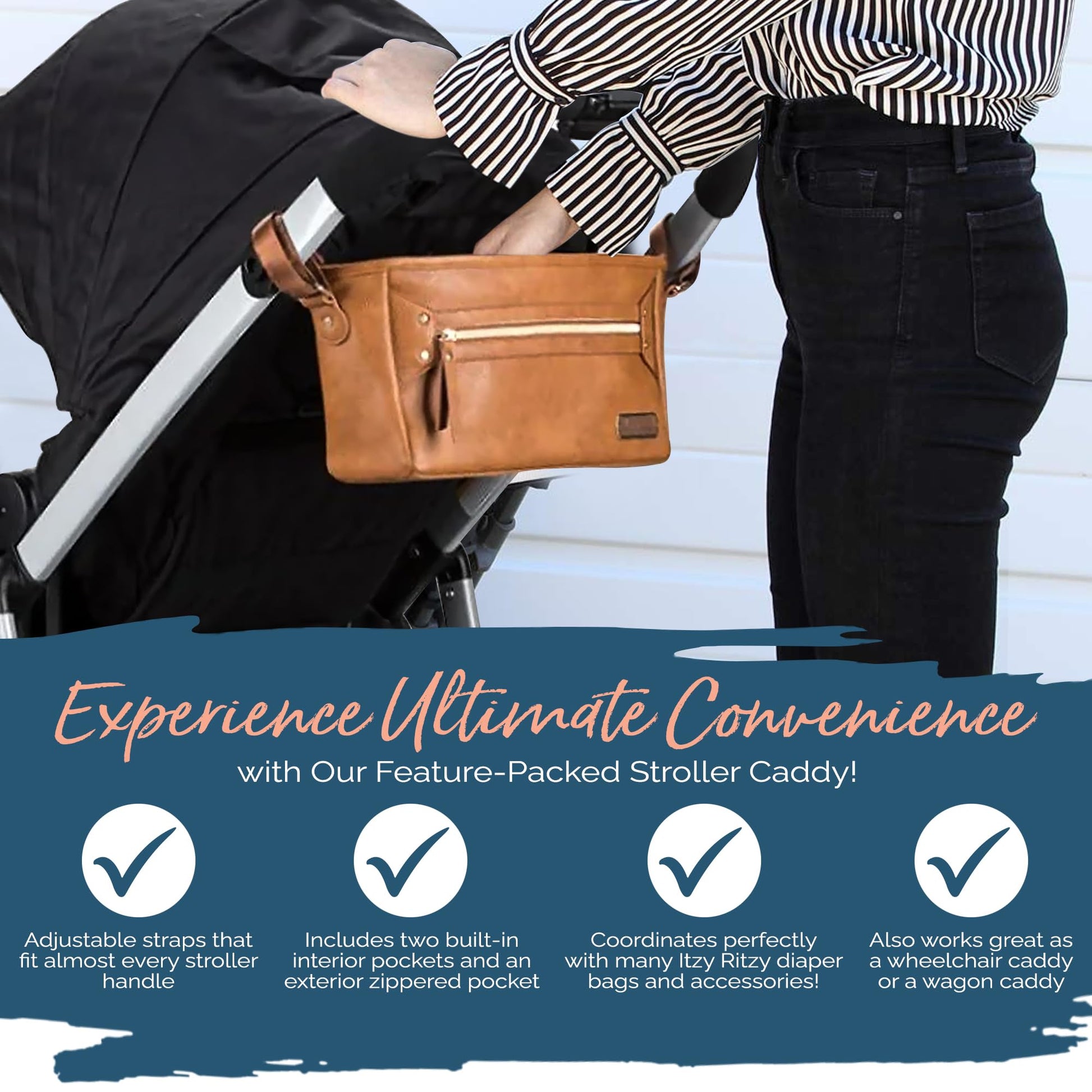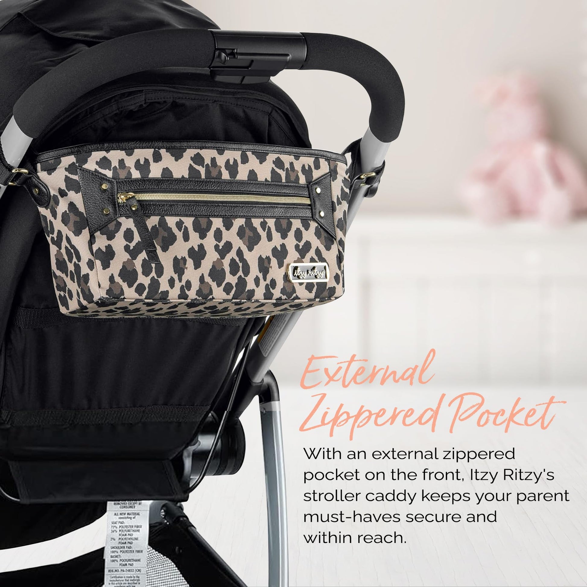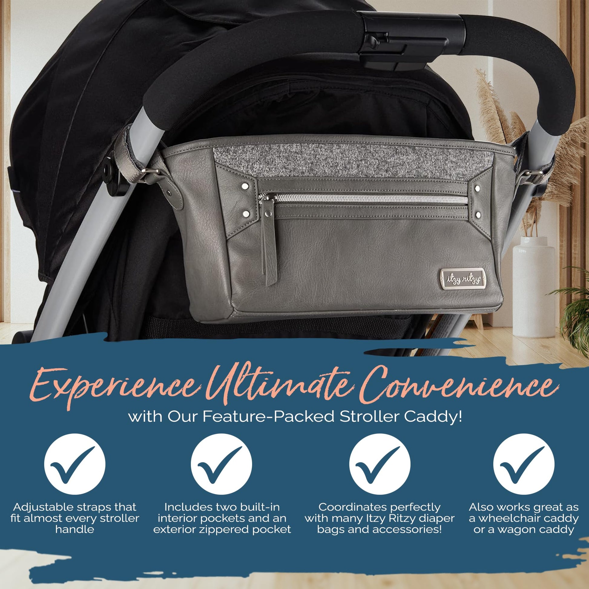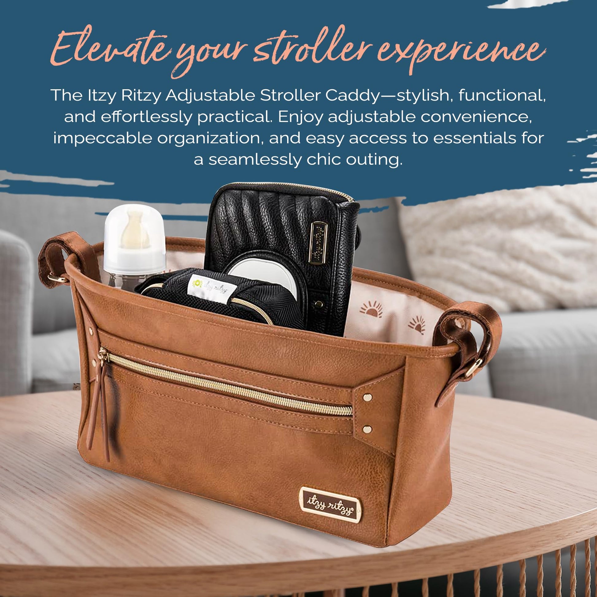 - COMPLETE YOUR ITZY RITZY COLLECTION: Pair the adjustable stroller caddy with coordinating items from our collection for a cohesive, fashionable look. Elevate your stroller game effortlessly, ensuring each journey showcases your personal style.