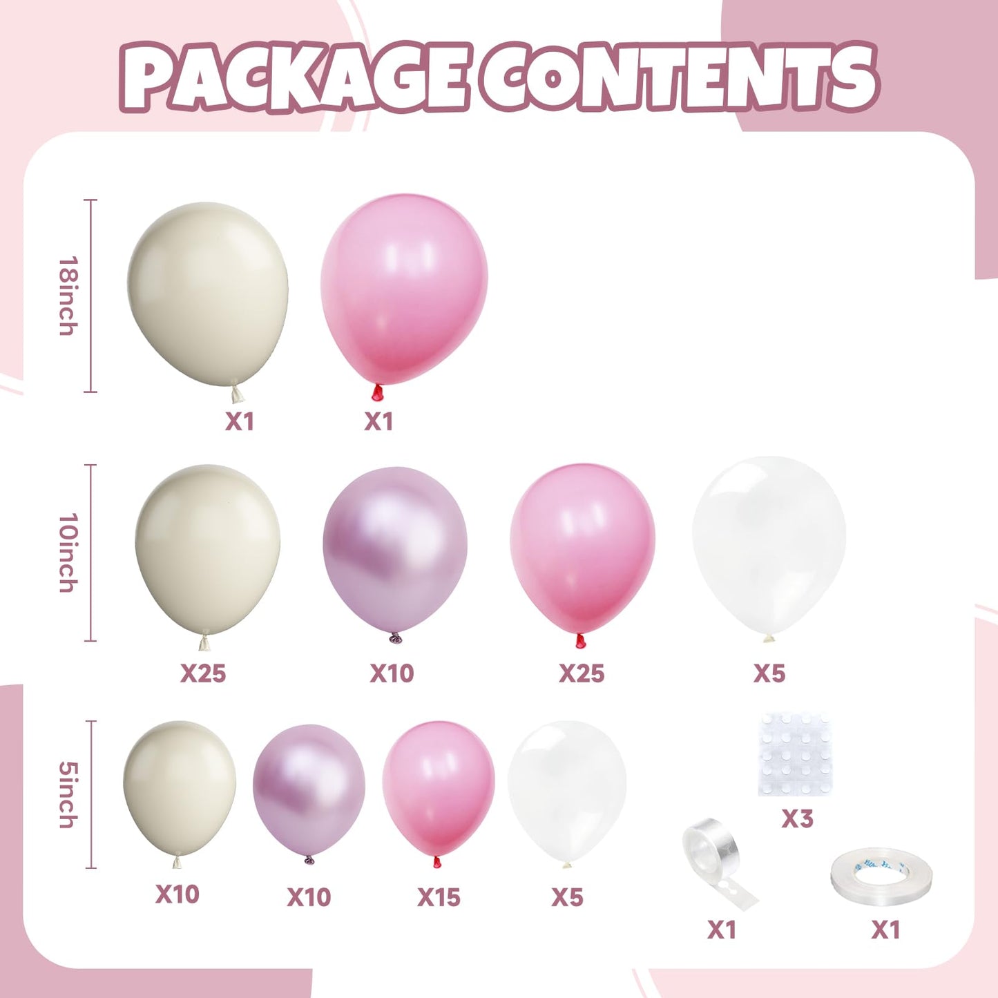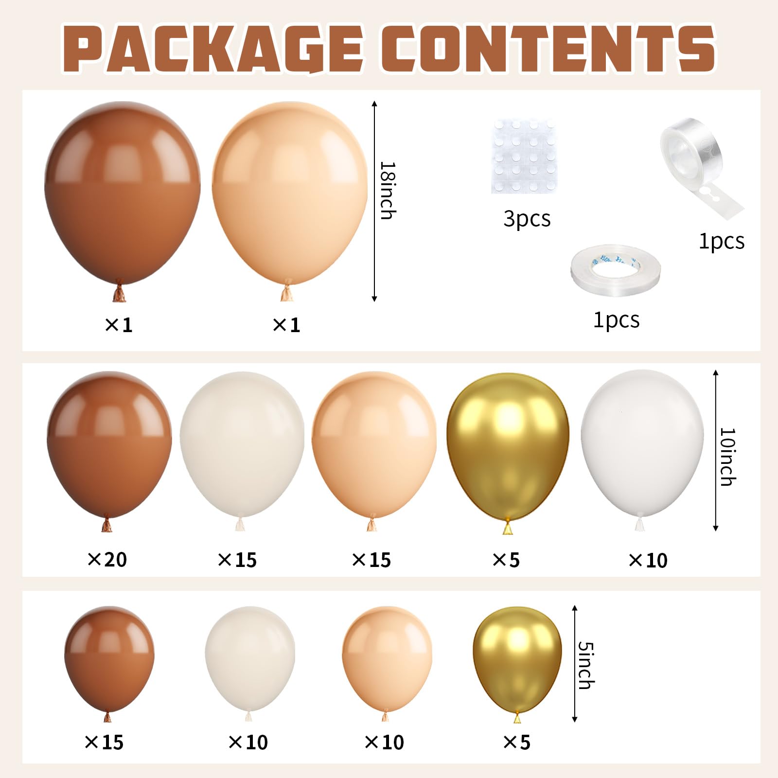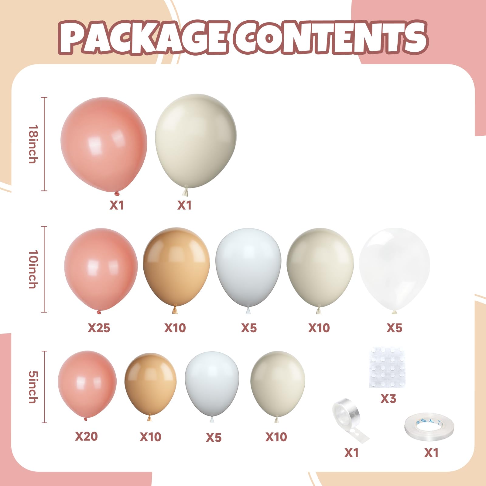 - BOHO IVORY WHITE BALLOON ARCH KIT: you will get 107pcs balloons,41pcs pastel orange balloons(5+10+18"),36pcs white sand balloons(5+10+18"),20pcs ivory white balloon balloons(5+10"),10pcs metallic champagne gold balloons(5+10"),1 balloon chain,1 ribbon and 3 glue points for easy assembly boho beige balloon arch kit
