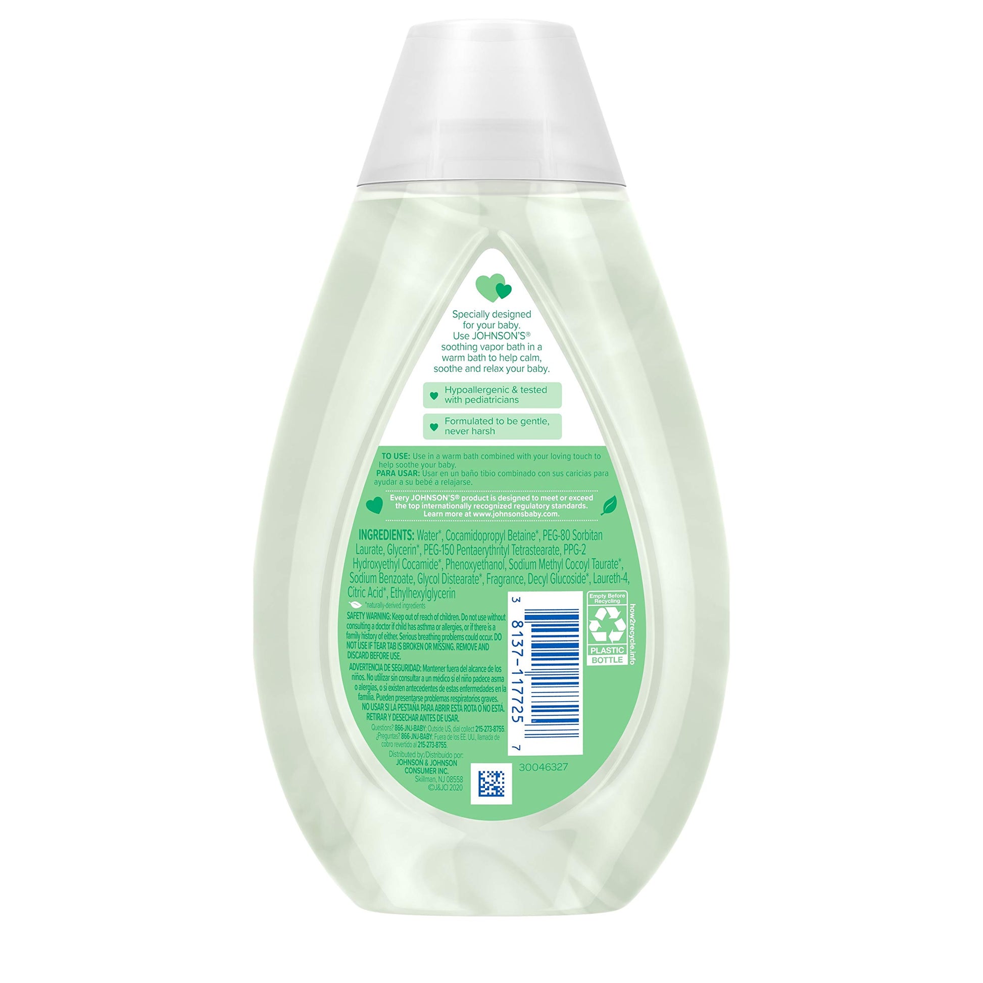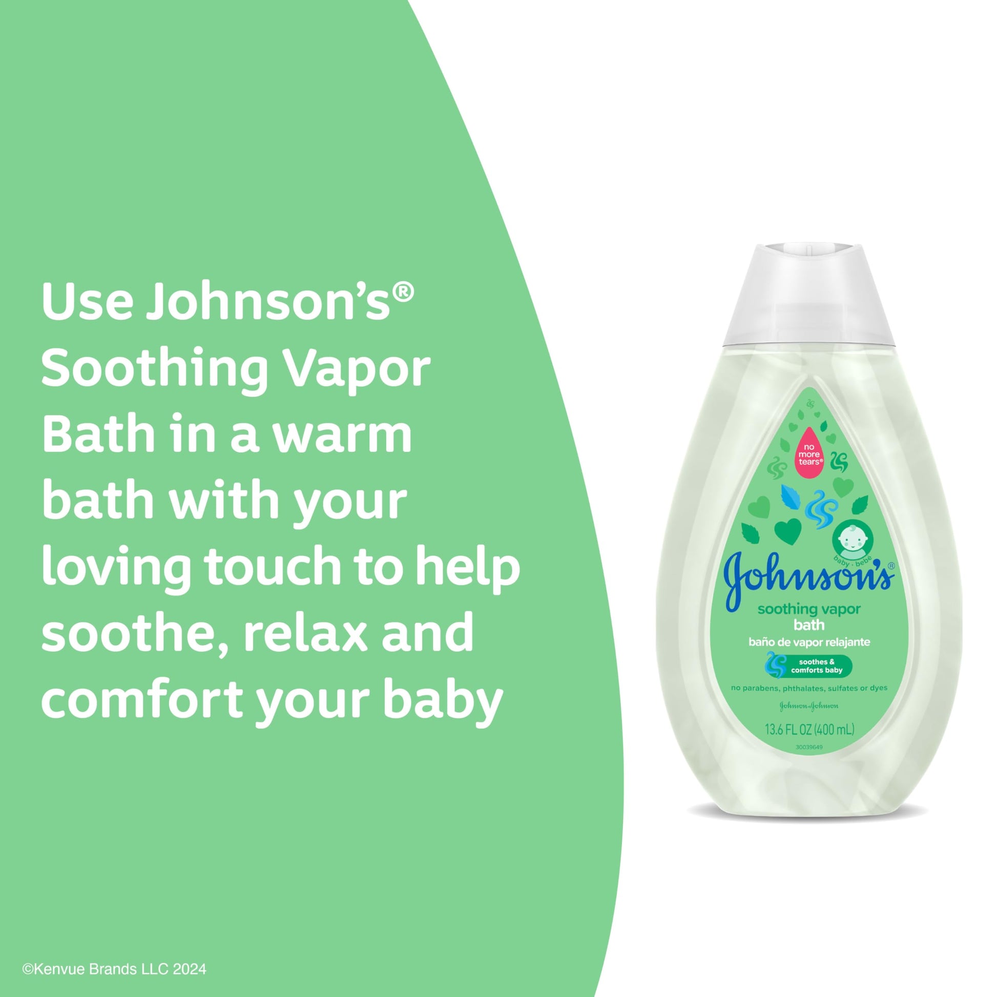Johnson's Soothing Vapor Baby Bath helps relax, soothe, and comfort fussy babies with gentle, calming aromas. Specially designed for baby's delicate skin, this tear-free liquid baby bath gently cleanses and is suitable for daily use. This gentle vapor bath contains soothing aromas to calm fussy babies. Made with Johnson's No More Tears formula, this tear-free baby bath liquid is gentle on eyes and is clinically proven to be mild for your baby's delicate skin. This hypoallergenic infant baby bath has been pediatrician tested and formulated free of parabens, phthalates, sulfates and dyes. Use Johnson's Soothing Vapor Bath in a warm bath with your loving touch to help soothe, relax and comfort your baby.