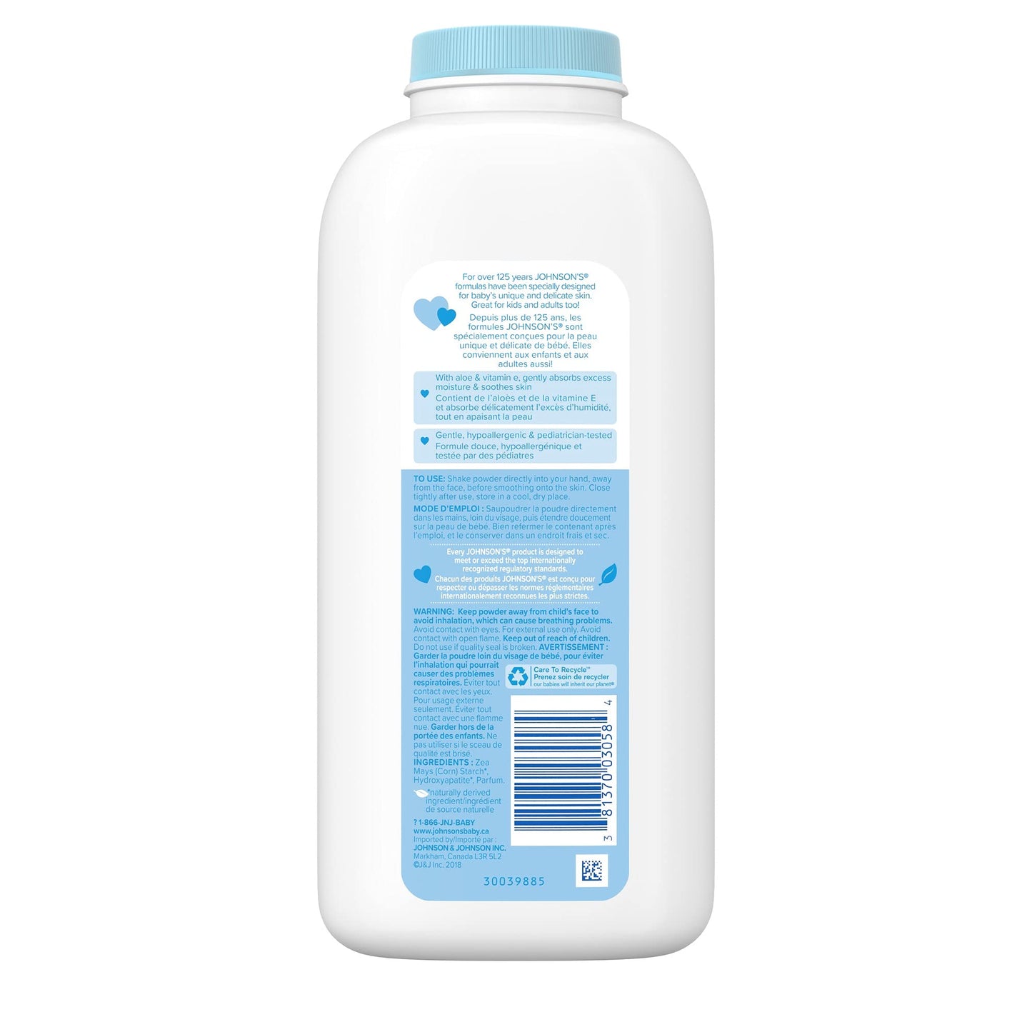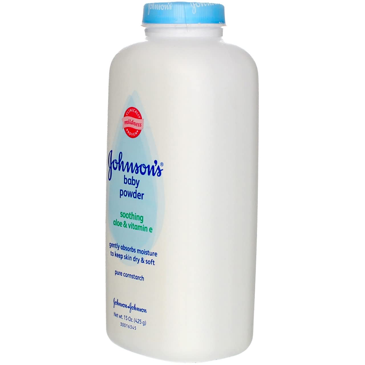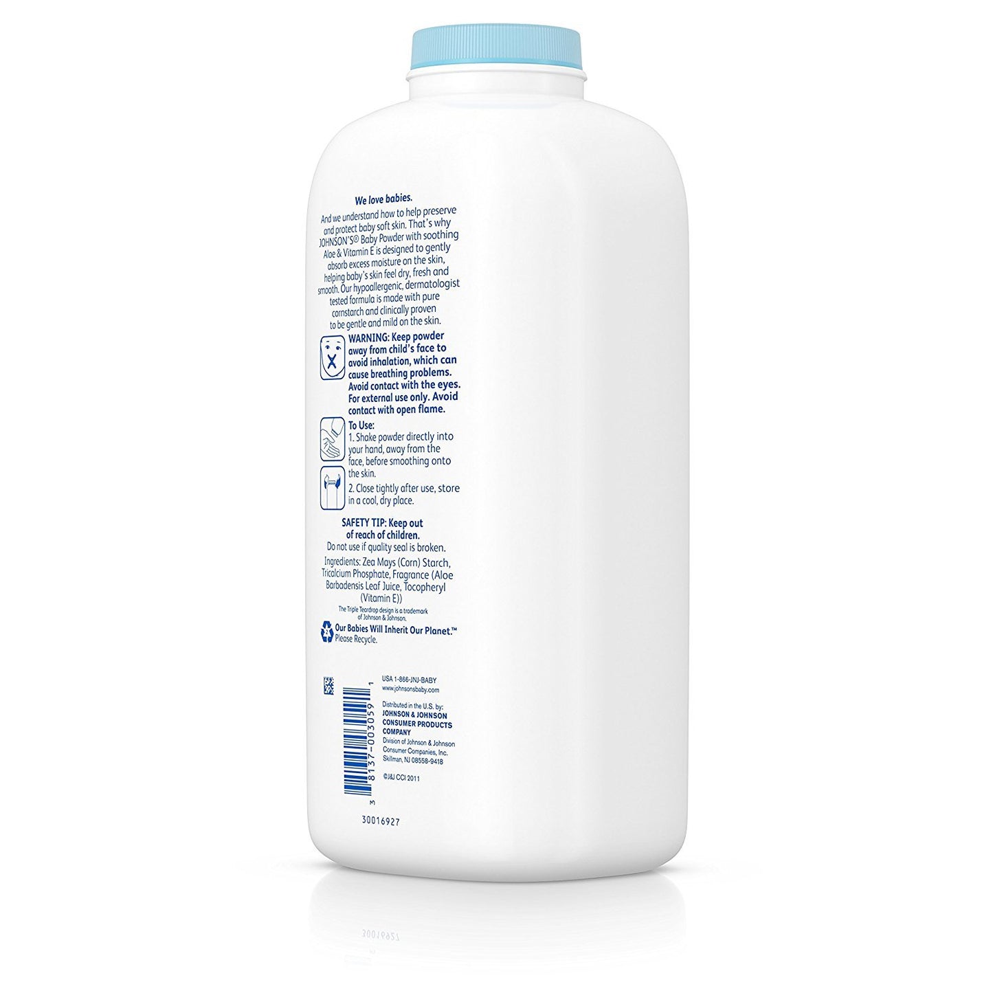 - 15-ounces of Johnson's baby powder with naturally derived cornstarch, aloe, and vitamin E provides a gentle way to soothe your baby's skin and leave it feeling soft and smooth