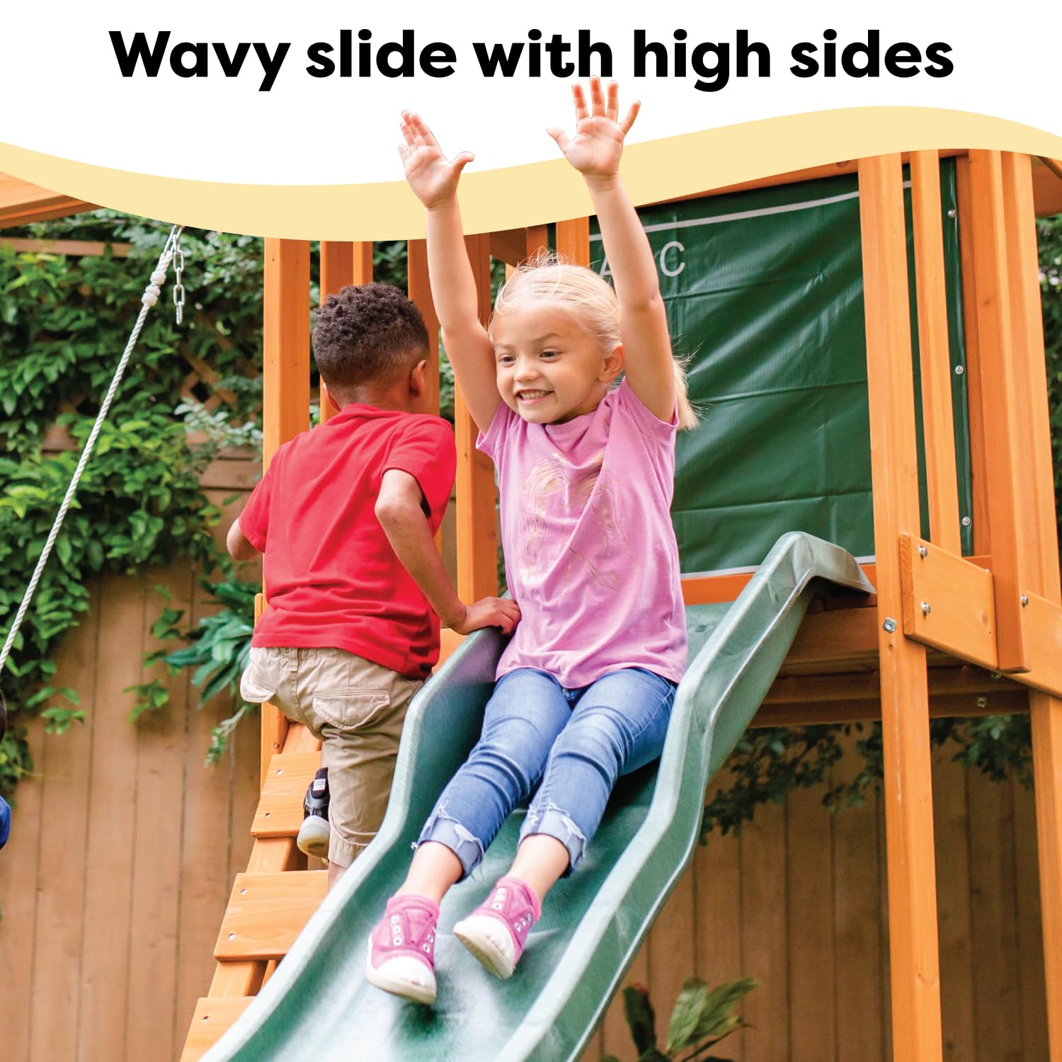- BUILT FOR OUTDOORS: Made to withstand the weather, this wooden backyard set is pre-treated with a water-based stain that includes UV and mold protection to hold up against the elements.