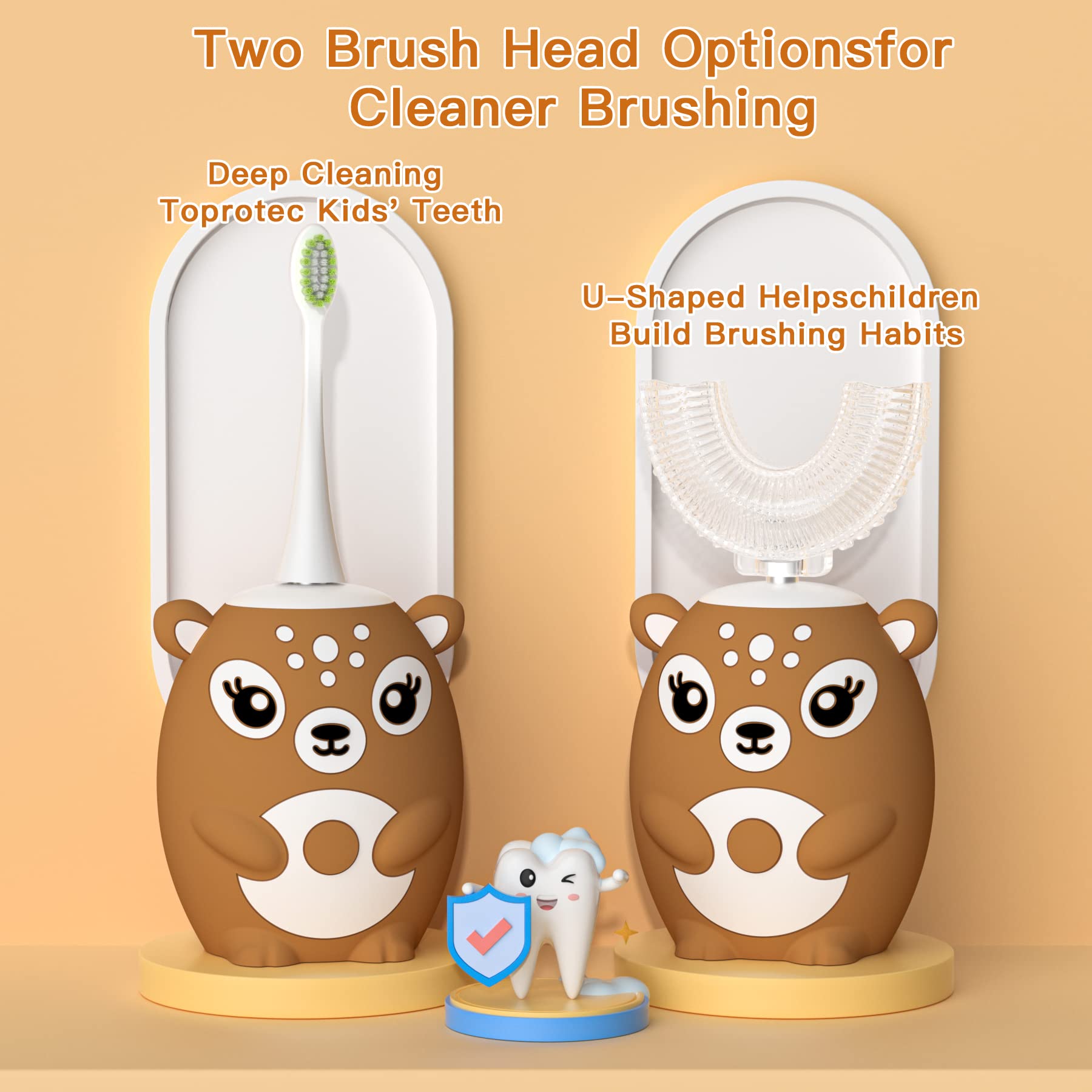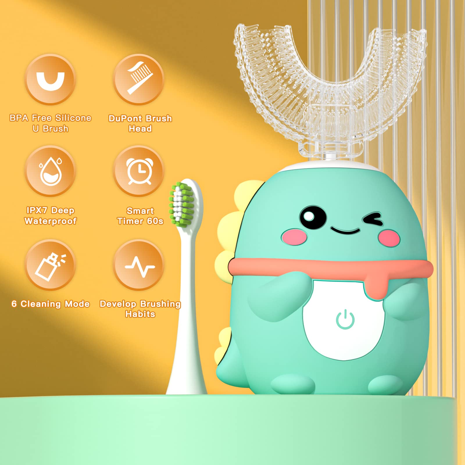 - Two Brush Heads Options: Kids electric toothbrushes provide two brush heads, food-grade silicone u-shaped brush head and soft brush head, U-shaped design is perfect for toddlers and children's teeth, soft silicone, providing a comfortable brushing sensation, thus developing healthy brushing habits, with the soft brush head for more efficient deep cleaning