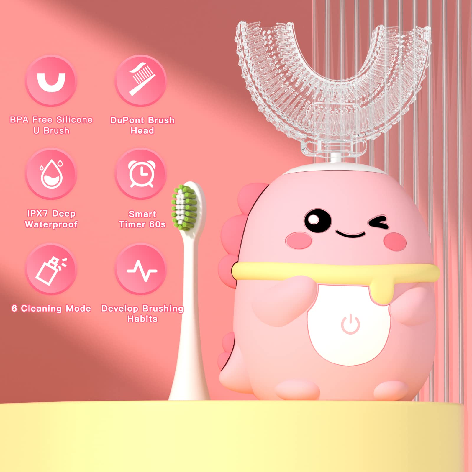 Kids Electric Toothbrush U Shaped Toddler Auto Sonic Toothbrushes with 5 Brush Head,Cartoon Dinosaur Ultrasonic Toothbrushes for Children 2-12 Years,360° Full Mouth Cleaning Automatic