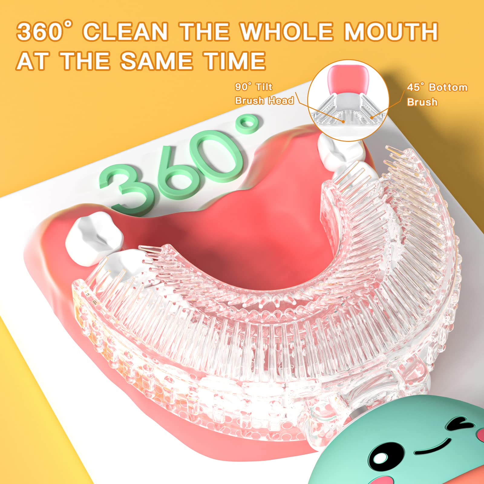 - Whole Mouth 360° Clean: Auto toddler toothbrush with 45° tilt brush head and 90° bottom brush would clean your child's teeth 360° in all directions, without missing any small deciduous teeth, effectively removing plaque