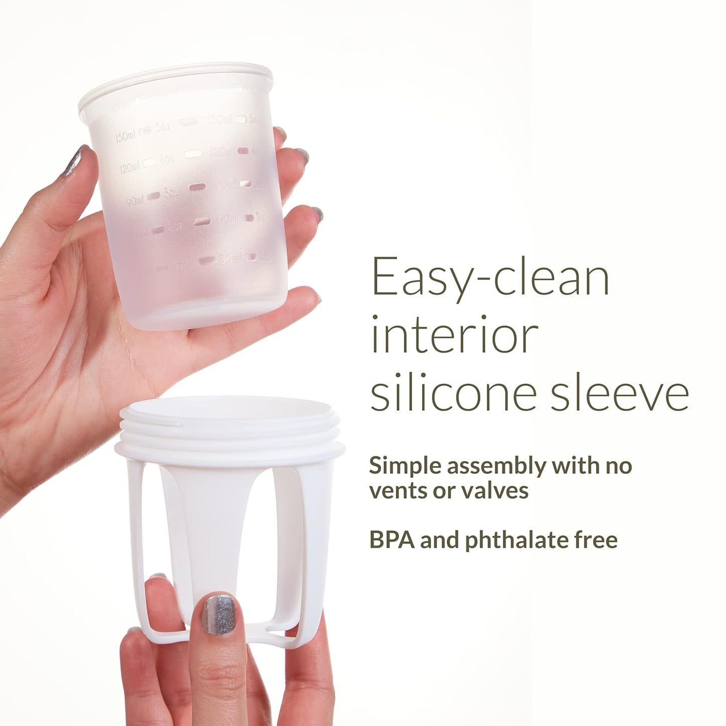 The silicone inner sleeve can be flipped inside-out for easy washing and drying, and it can also be boiled, sterilized, microwaved or frozen. The bottle system has no straws, vents or valves, so it is easy to clean and assemble.