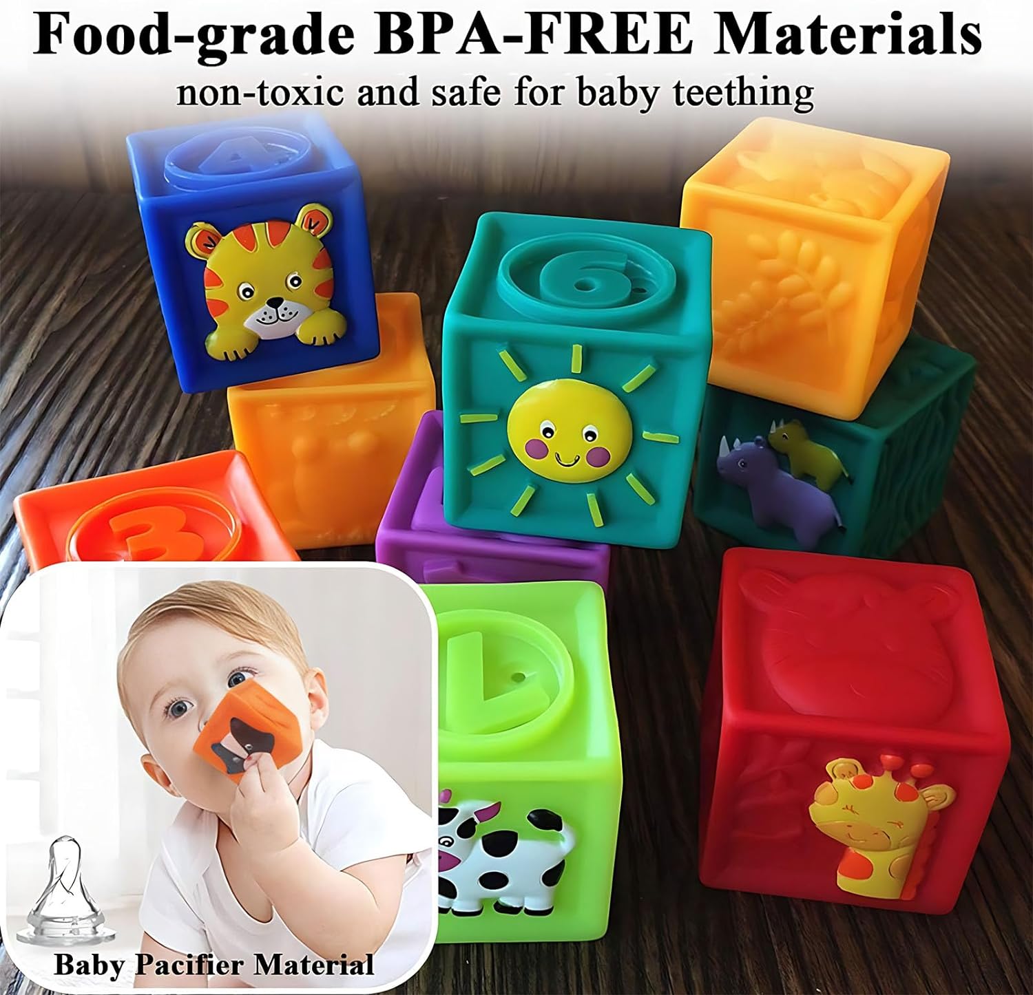 - 🎉SAFE BPA-FREE SILICONE MATERIALS - These squeeze baby blocks are made of food-grade silicone materials which is the same as the baby pacifier. Non-toxic and odorless, safe for baby play, even teething. 100°C high-temperature resistance, can be boiled to disinfect. (Note: Please do not boil for too long time.)