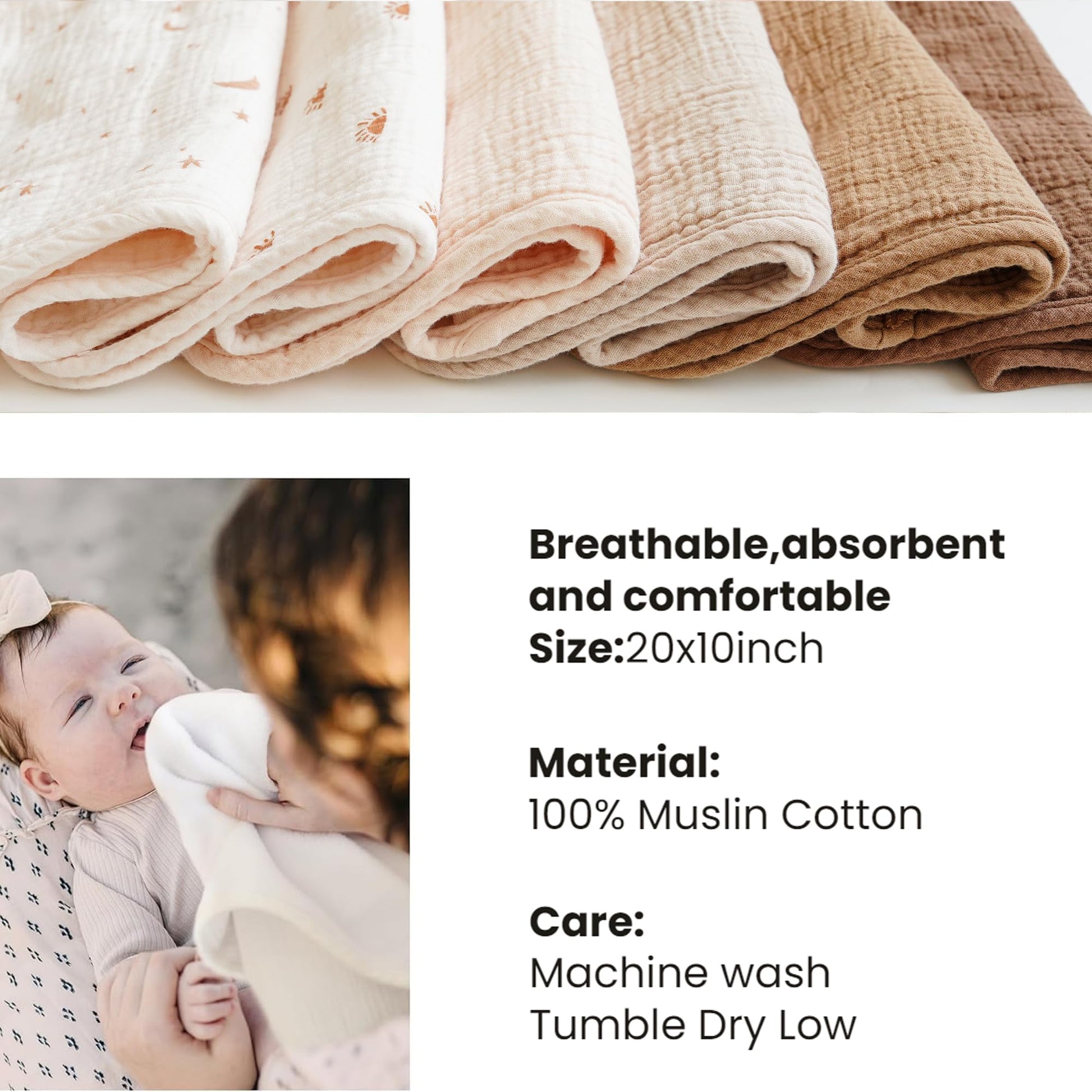 - Soft & Absorbent: These muslin burp cloths are crafted from 100% cotton for superior absorption and a gentle, skin-friendly touch. The ultra soft and highly absorbent cotton fabric is ideal for your baby's delicate skin
